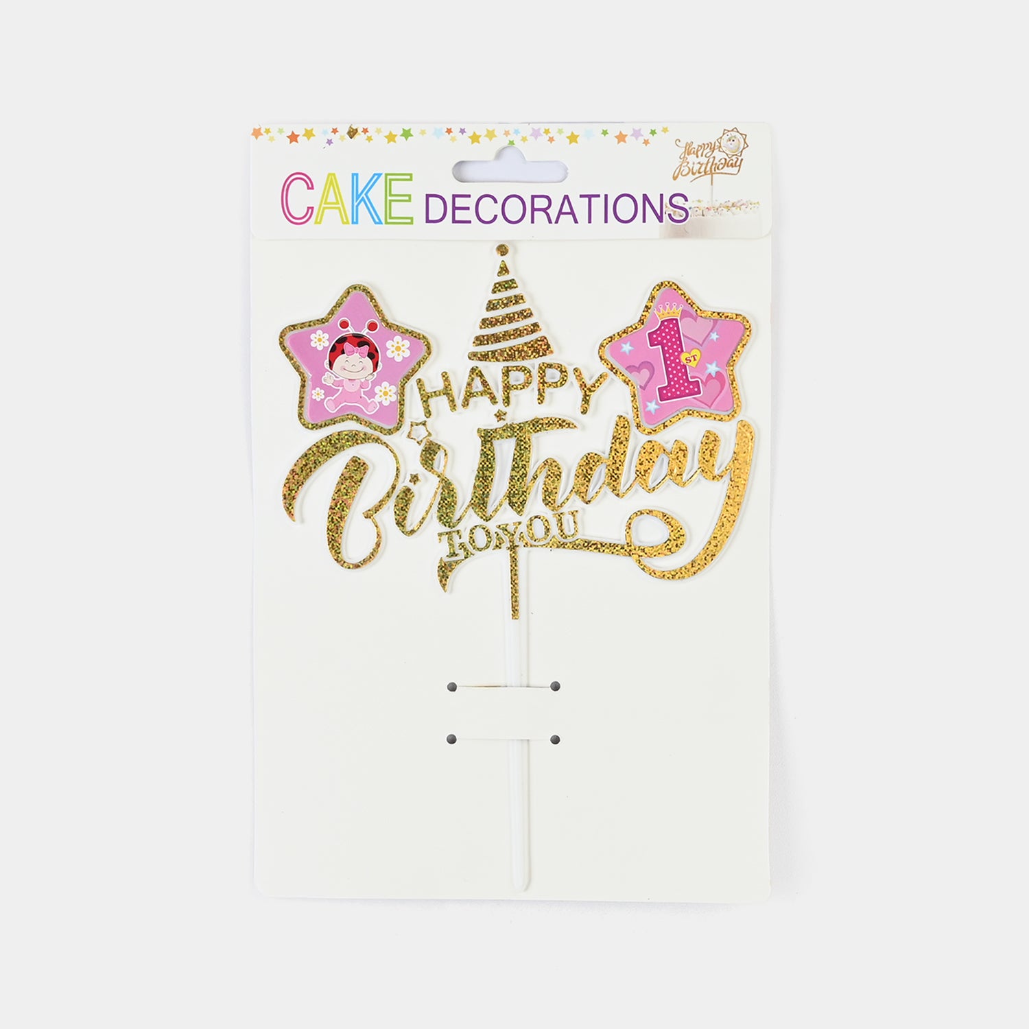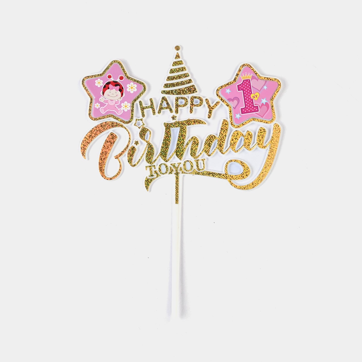 This golden birthday topper features a cap and stars theme, adding a festive and elegant touch to any celebration cake.
