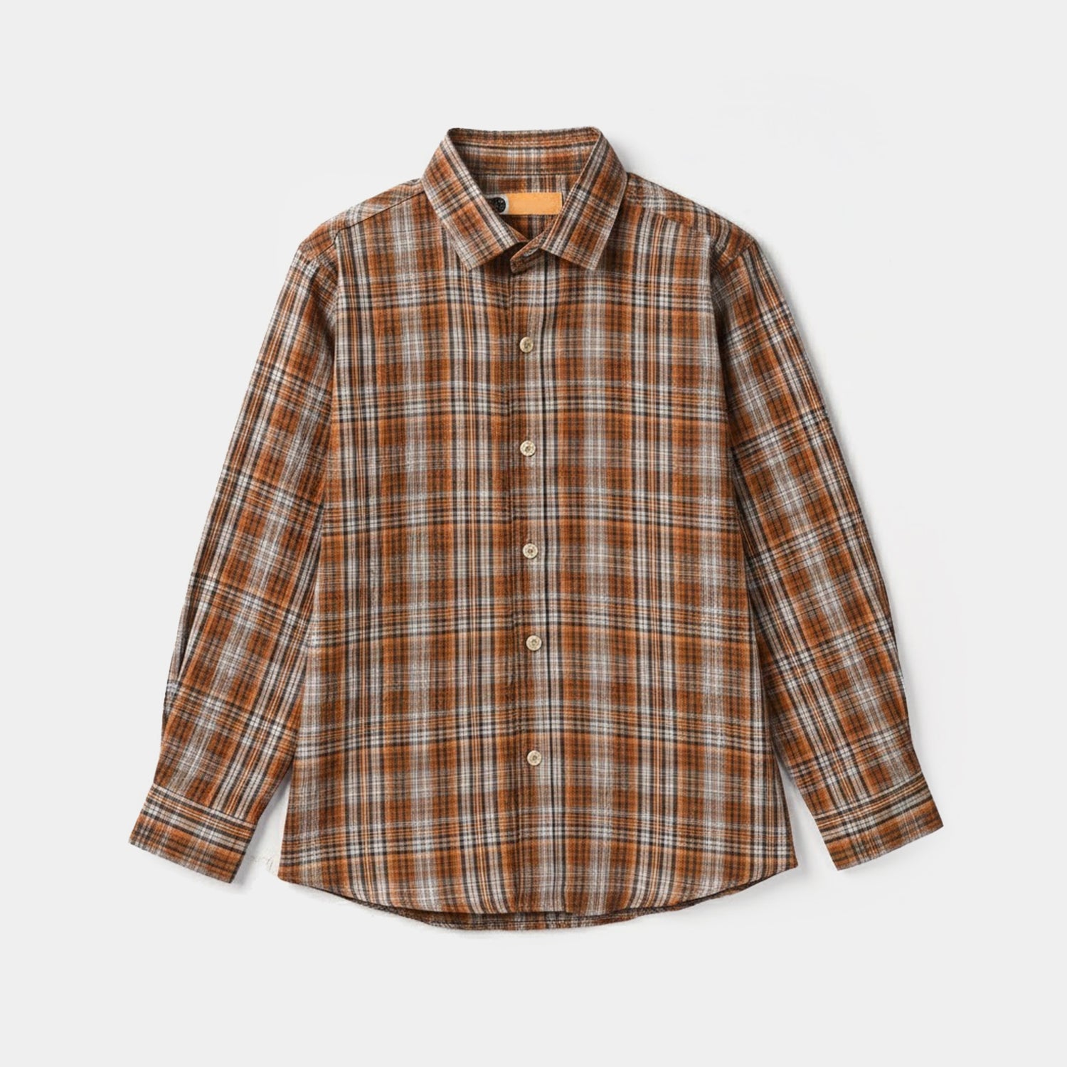 Boys’ yarn-dyed shirt in front brown features a checked print, button-down front, collar, and cuffed sleeves.