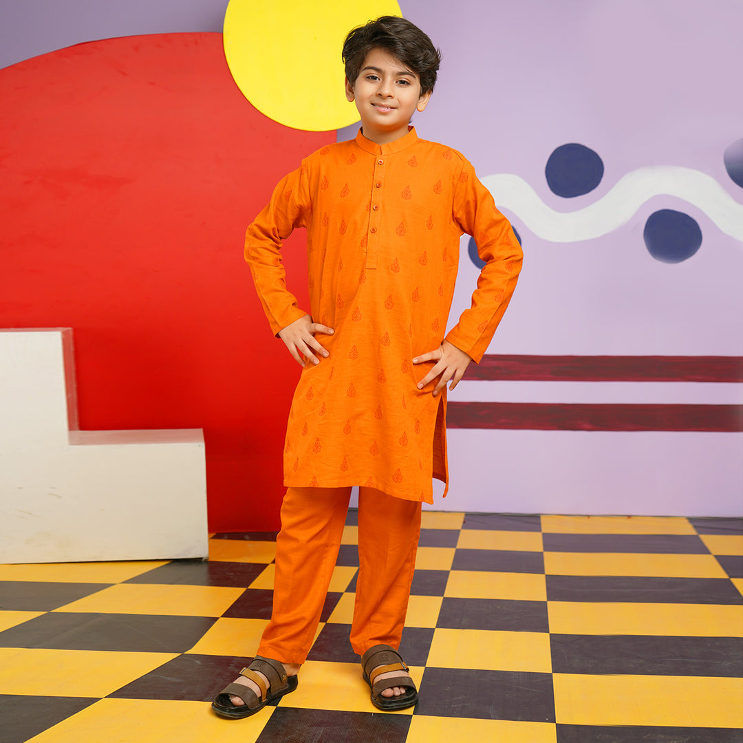 Boys Cotton Slub Shalwar Suit (DAMASK)-B.Orange