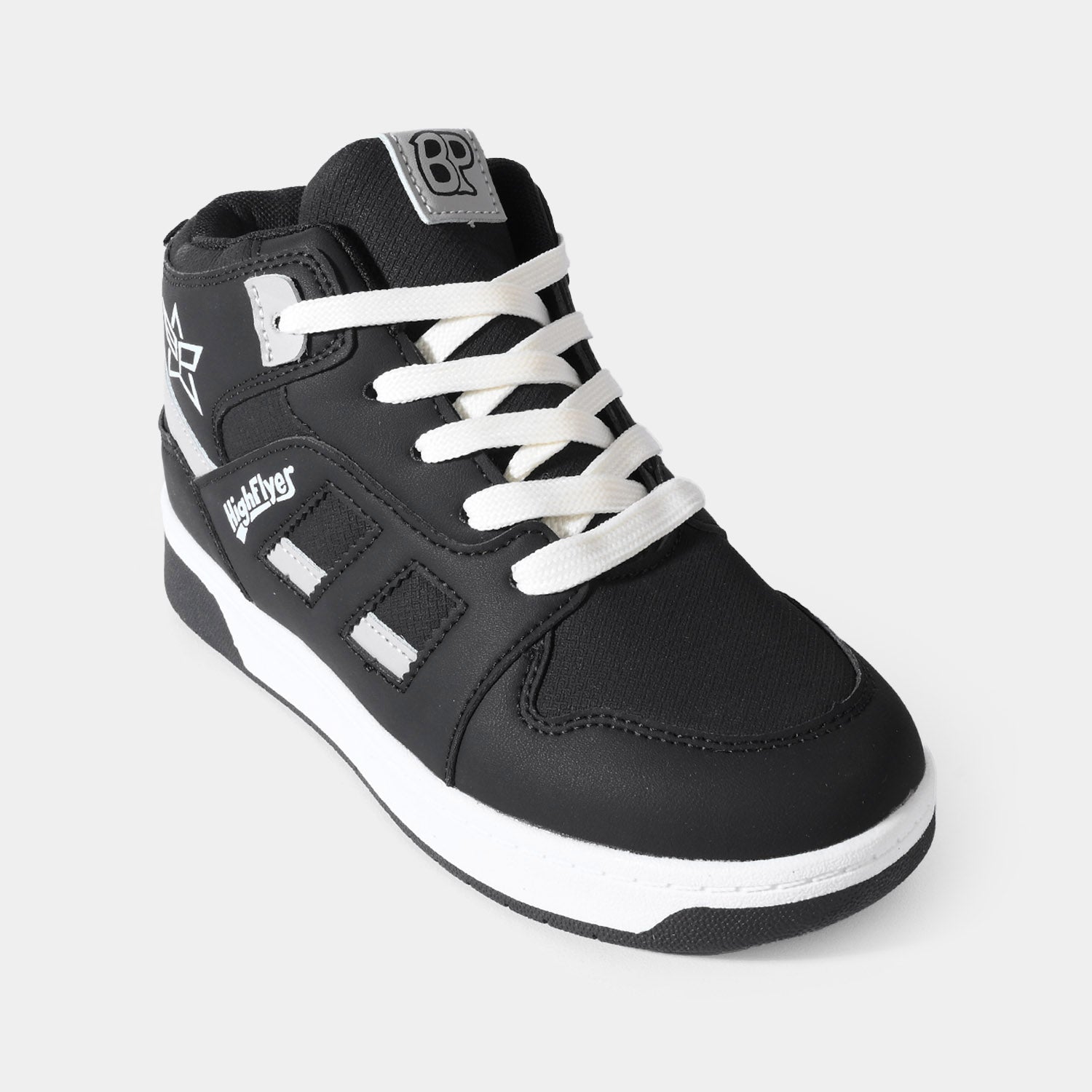 Boys’ boots featuring secure laces, a black base, white contrast detailing with a “High Flyer” printed design for a stylish and comfortable look.