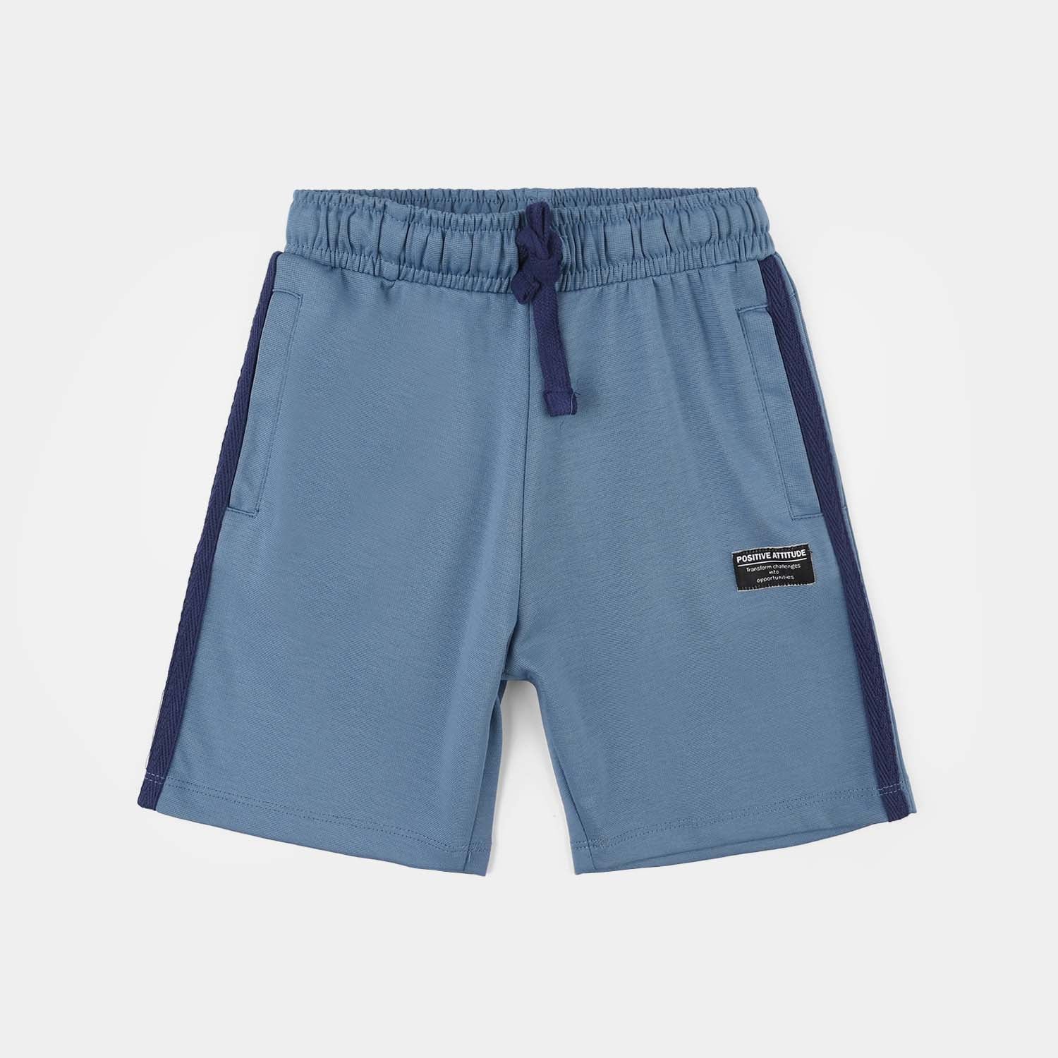 These blue poly jersey shorts for boys feature a comfortable fit with a “Positive Attitude” print, perfect for casual and playful everyday wear.