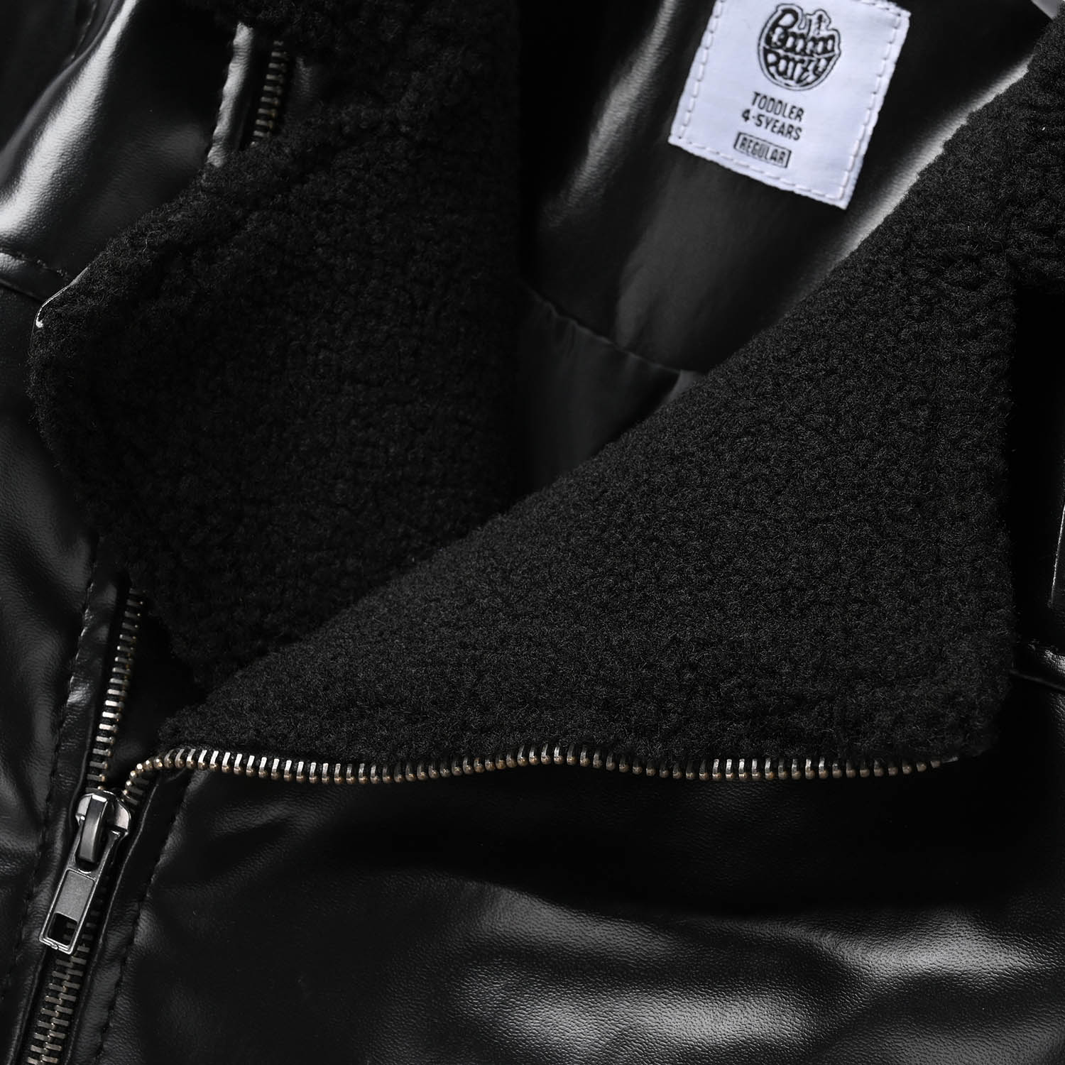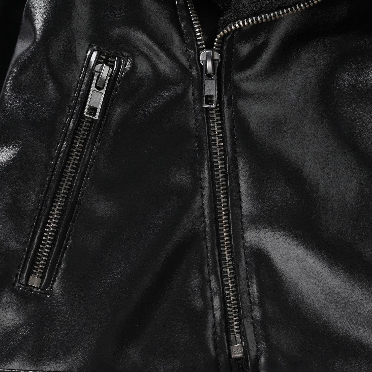 This black short-length boys' PU leather jacket features a collar, full sleeves, and zippered pockets, offering a stylish and versatile look.
