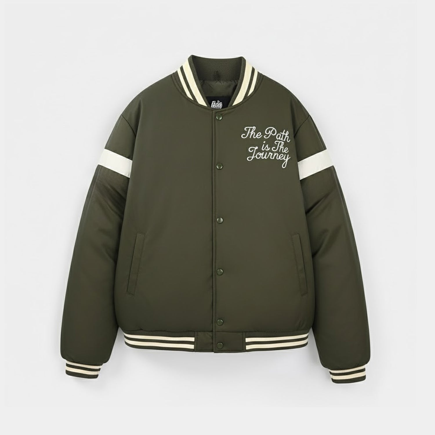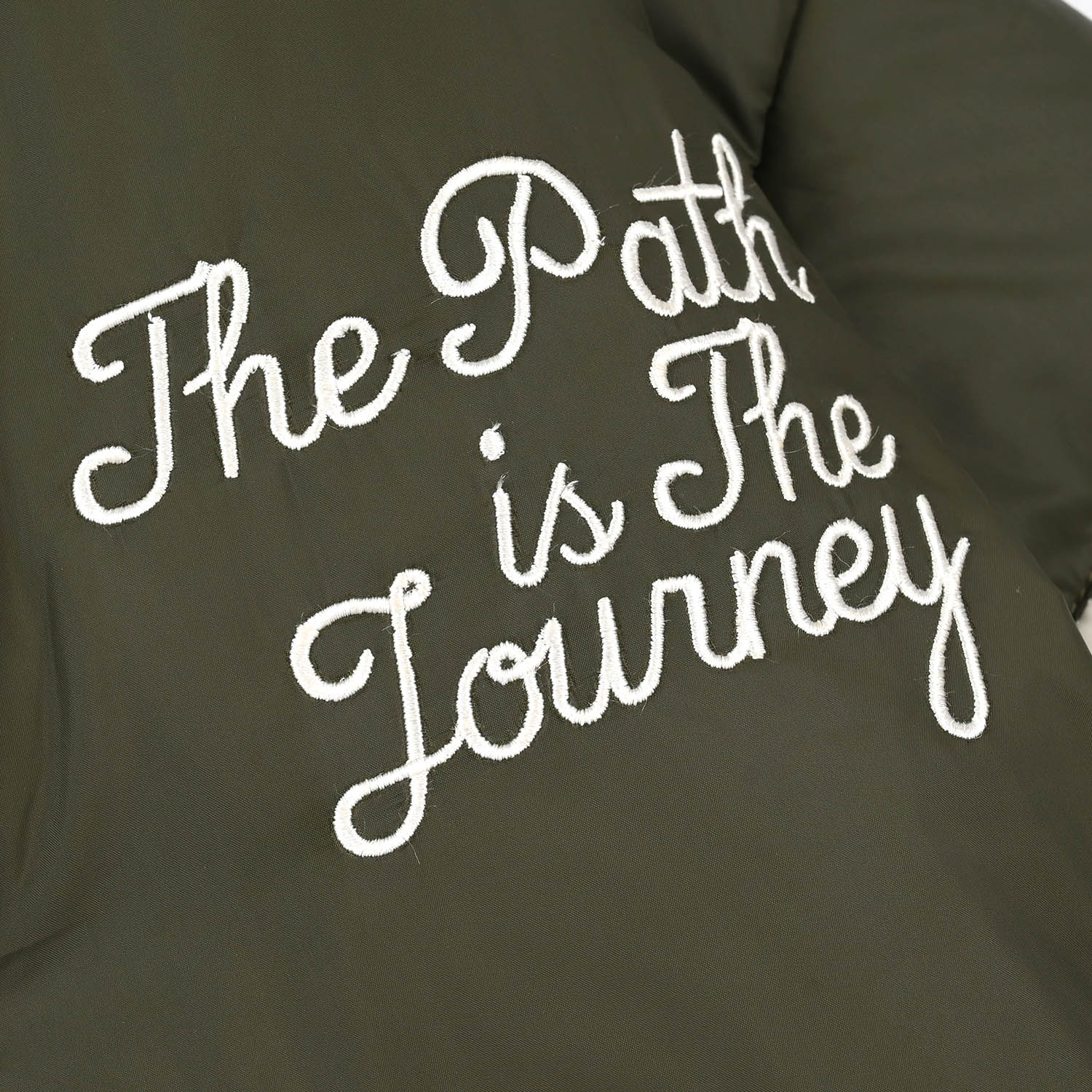 This green boys puffer jacket features a button opening, pockets, full sleeves, and “The path is the journey” text embroidery on the front, perfect for easy layering over any outfit.