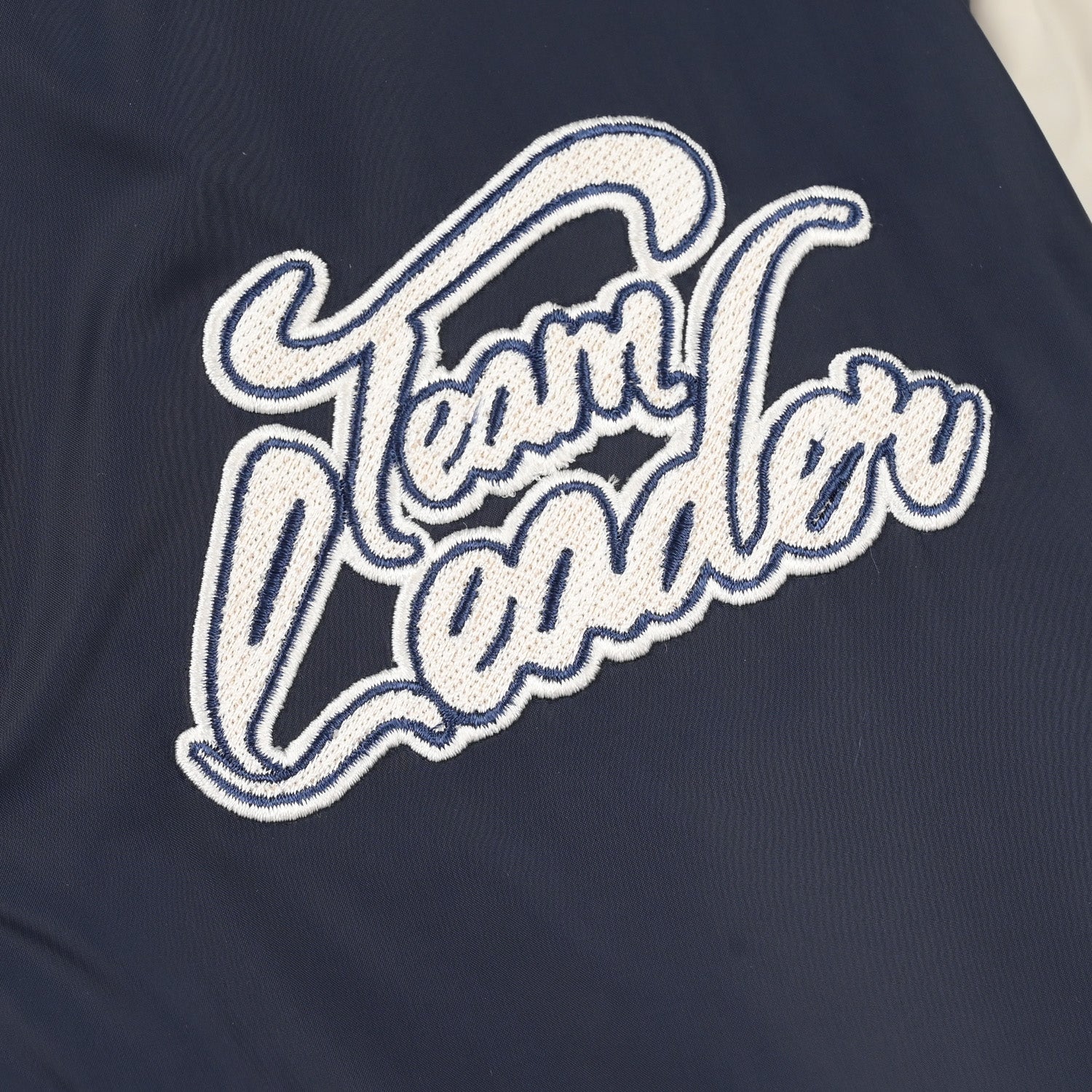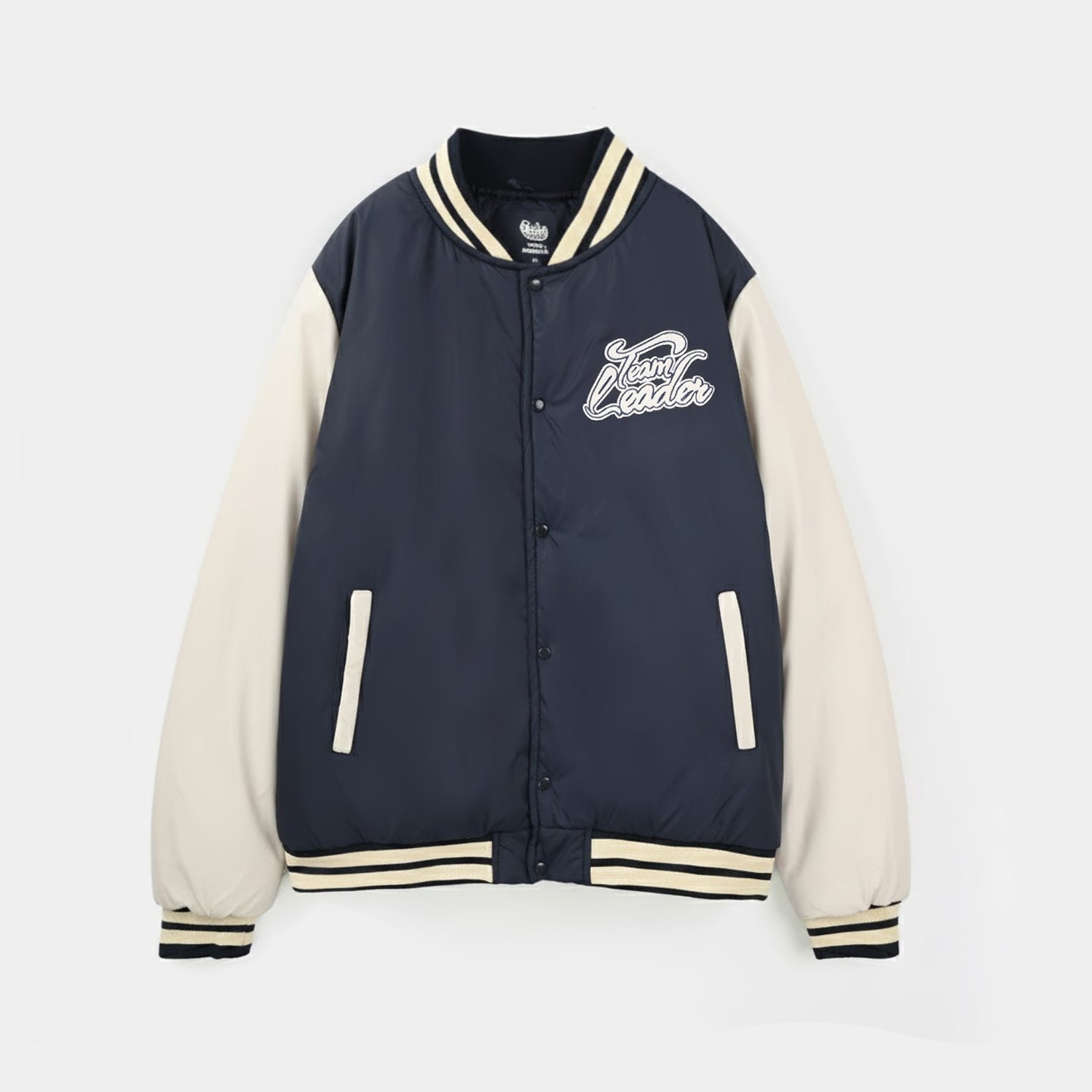 This black boys puffer jacket features a button opening, pockets, contrasting full sleeves, and “Team Leader” embroidery on the front, perfect for easy layering over any outfit.