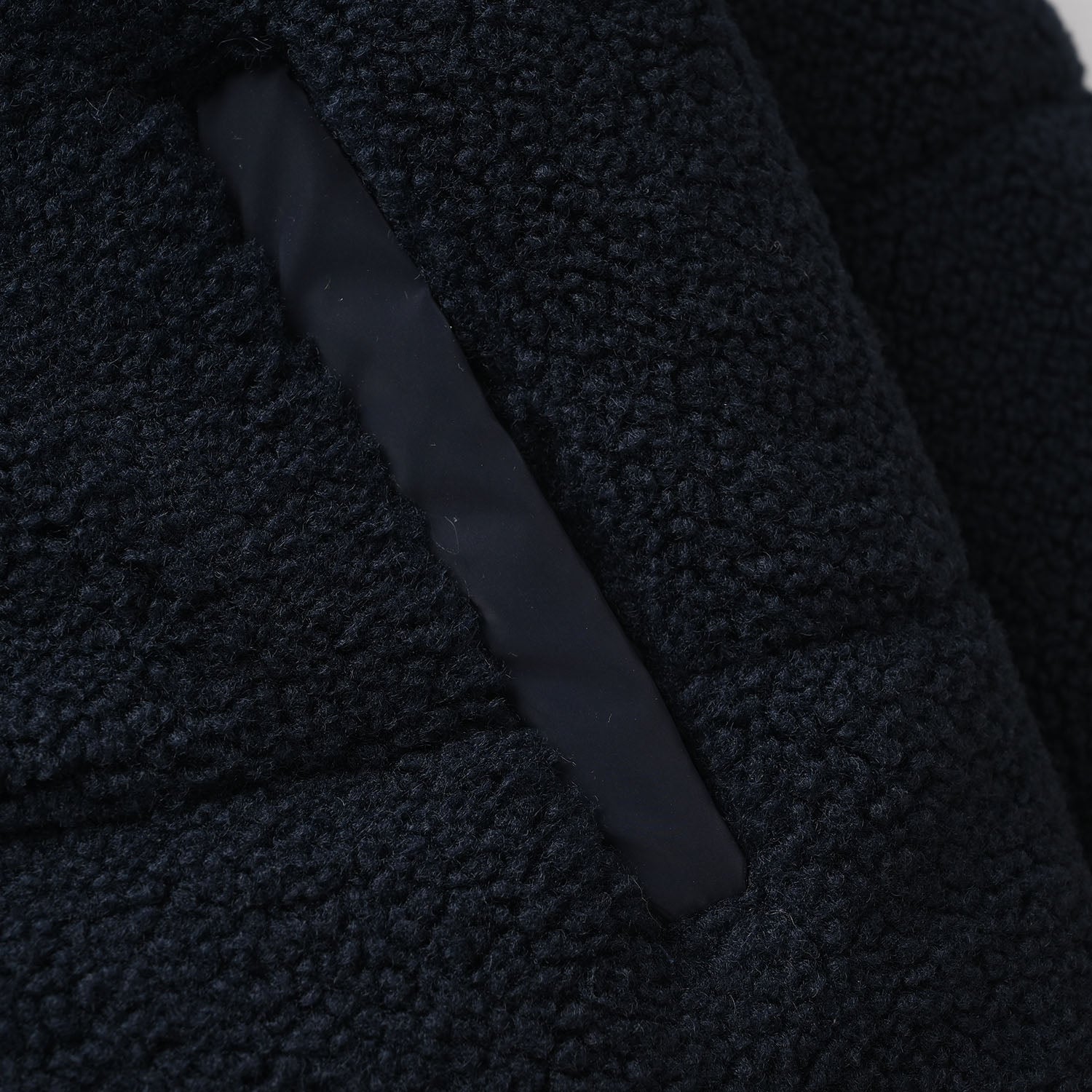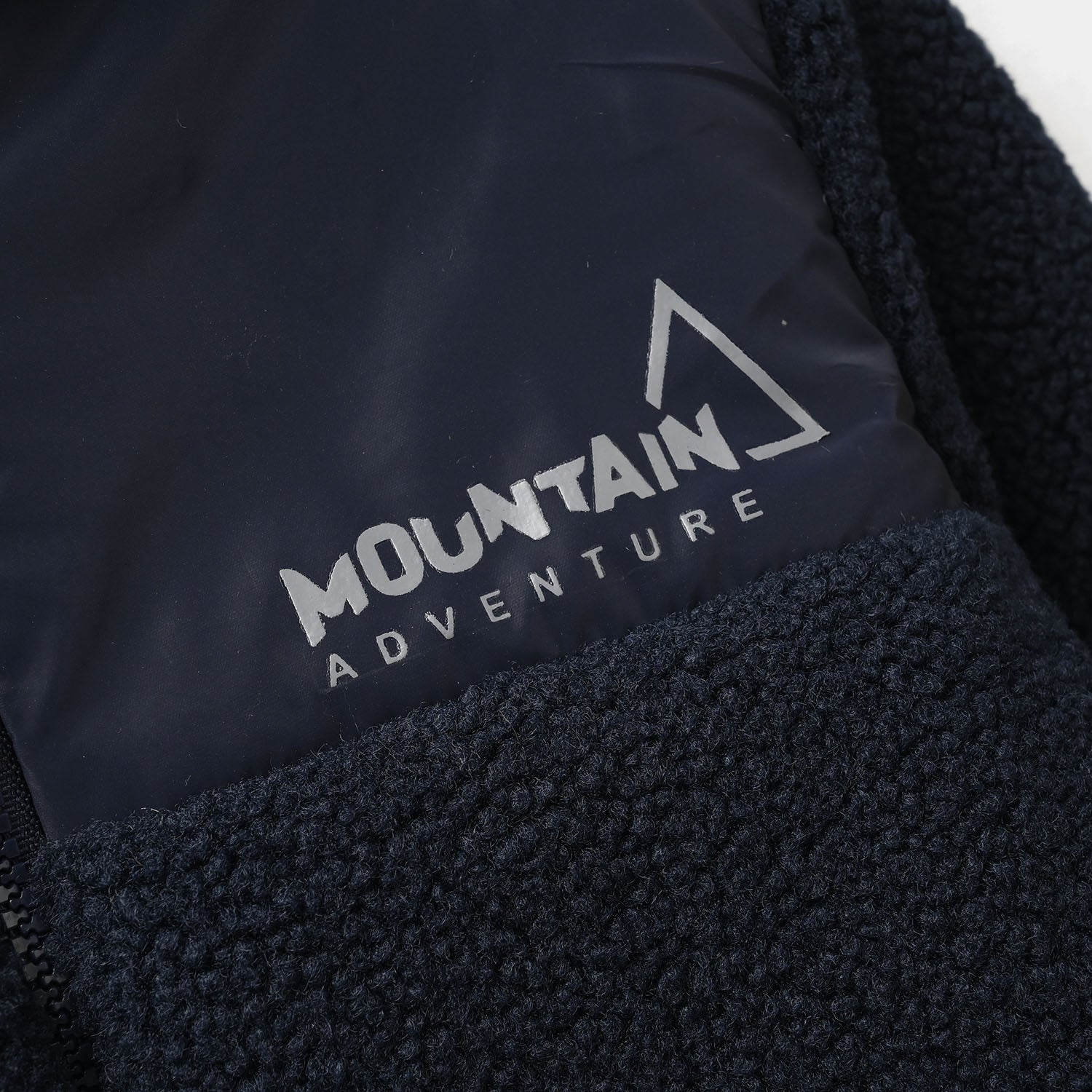 Boys quilted jacket featuring a high neck, full sleeves, front zipper, mountain embroidery, and pockets for a stylish and cozy look.
