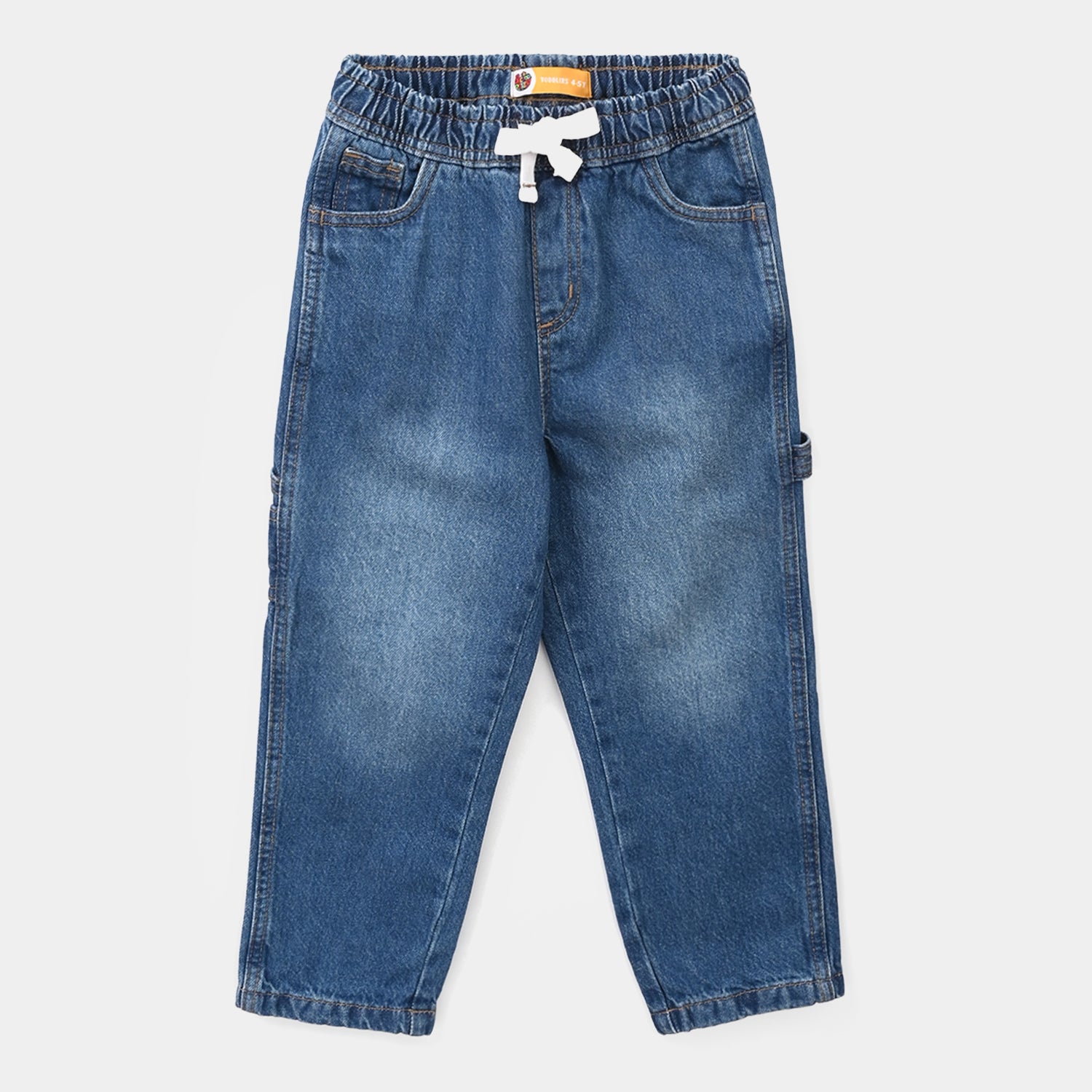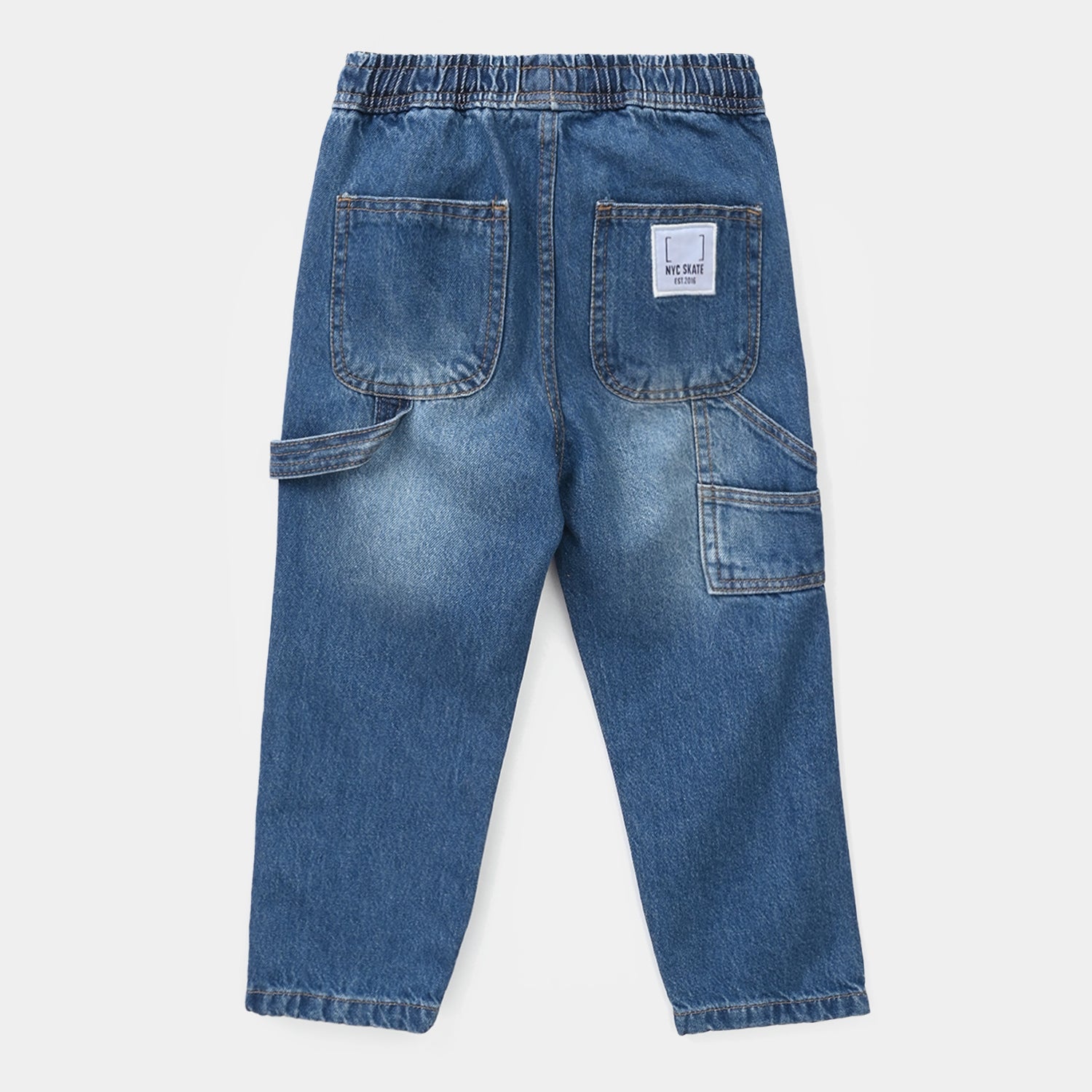 Boys mid blue denim stretch pants featuring "NYC Skate" print and pockets, perfect for a casual and comfortable everyday look.