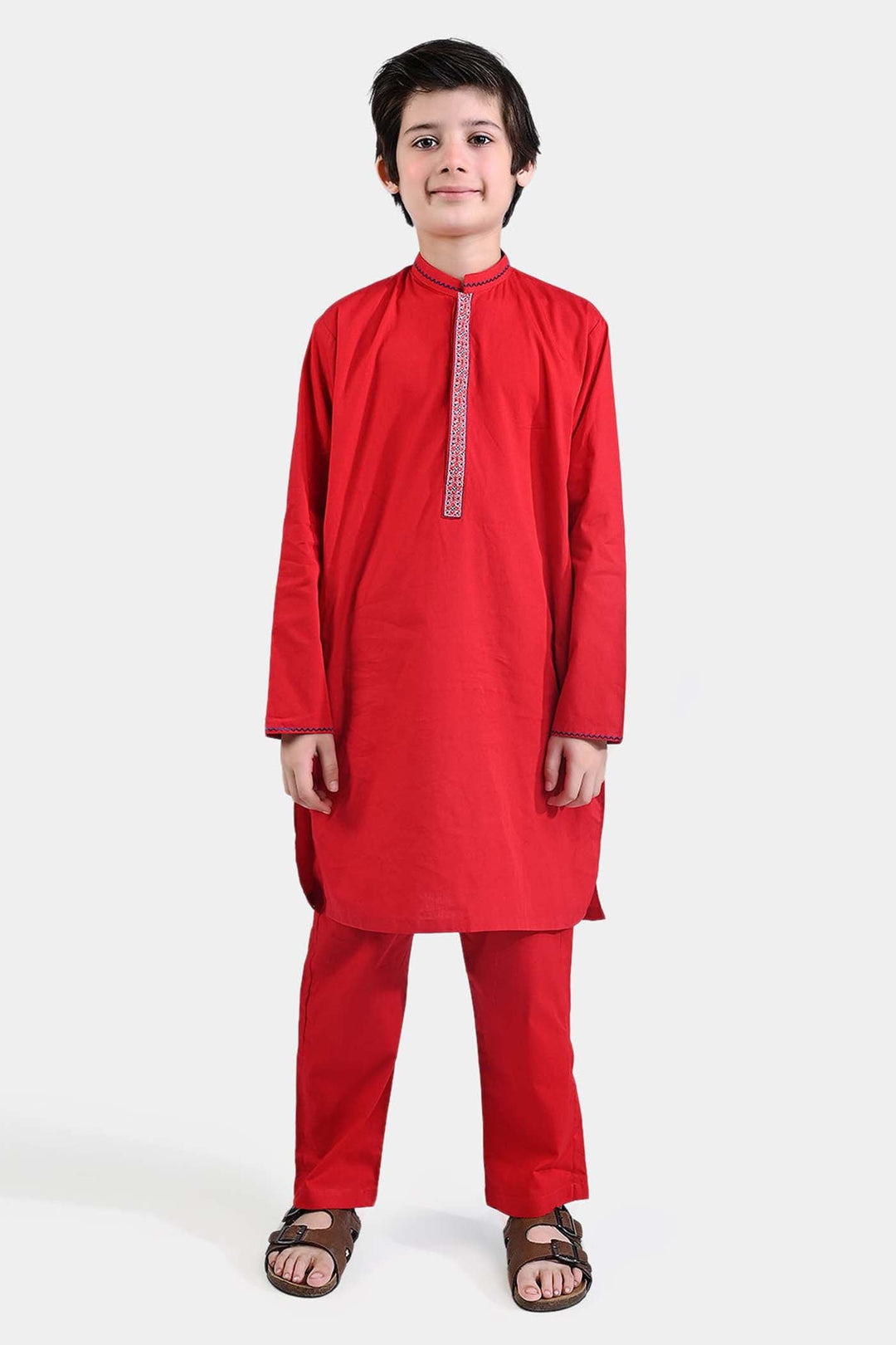 Boys Cotton Slub Shalwar Suit (Cuff Styling)-Reddish