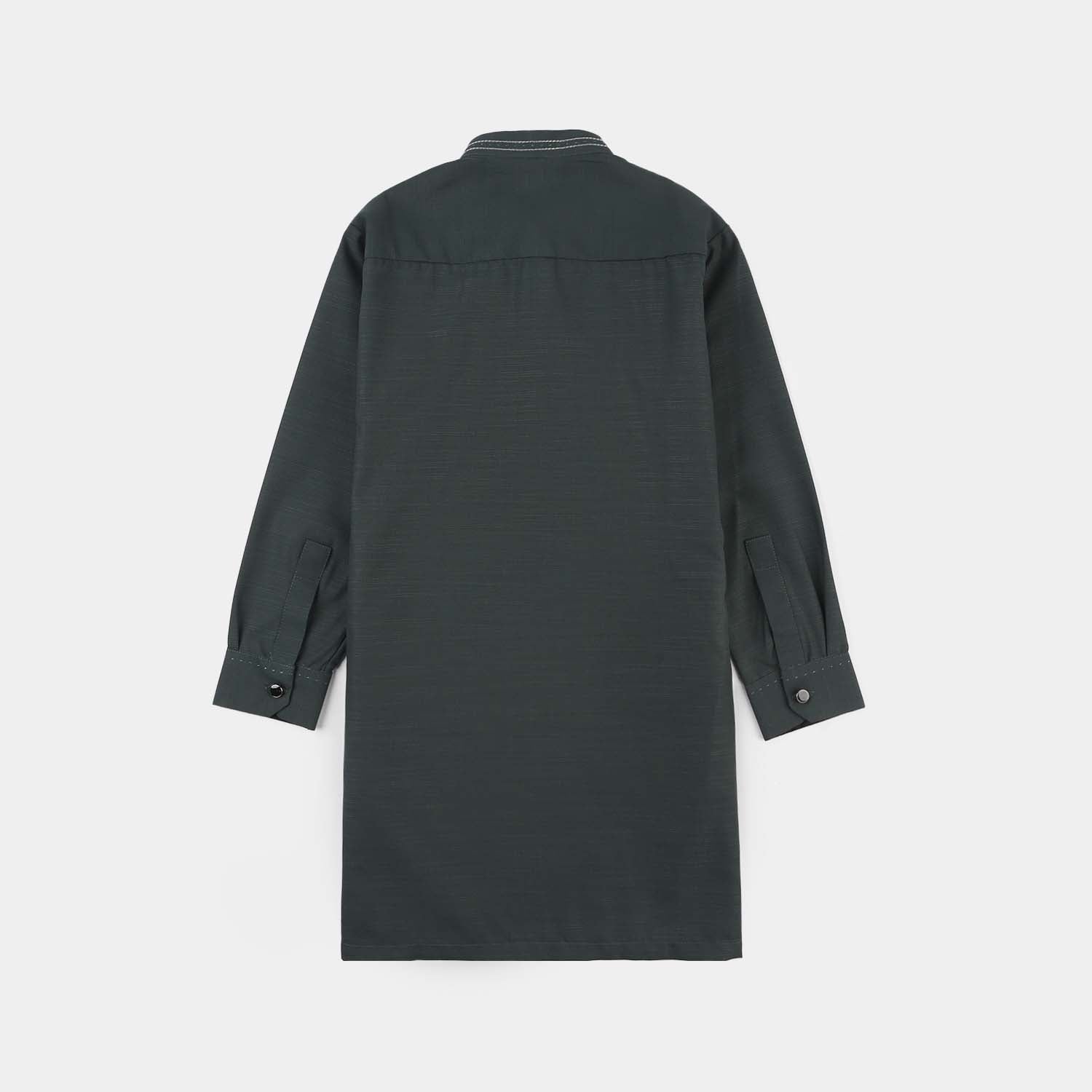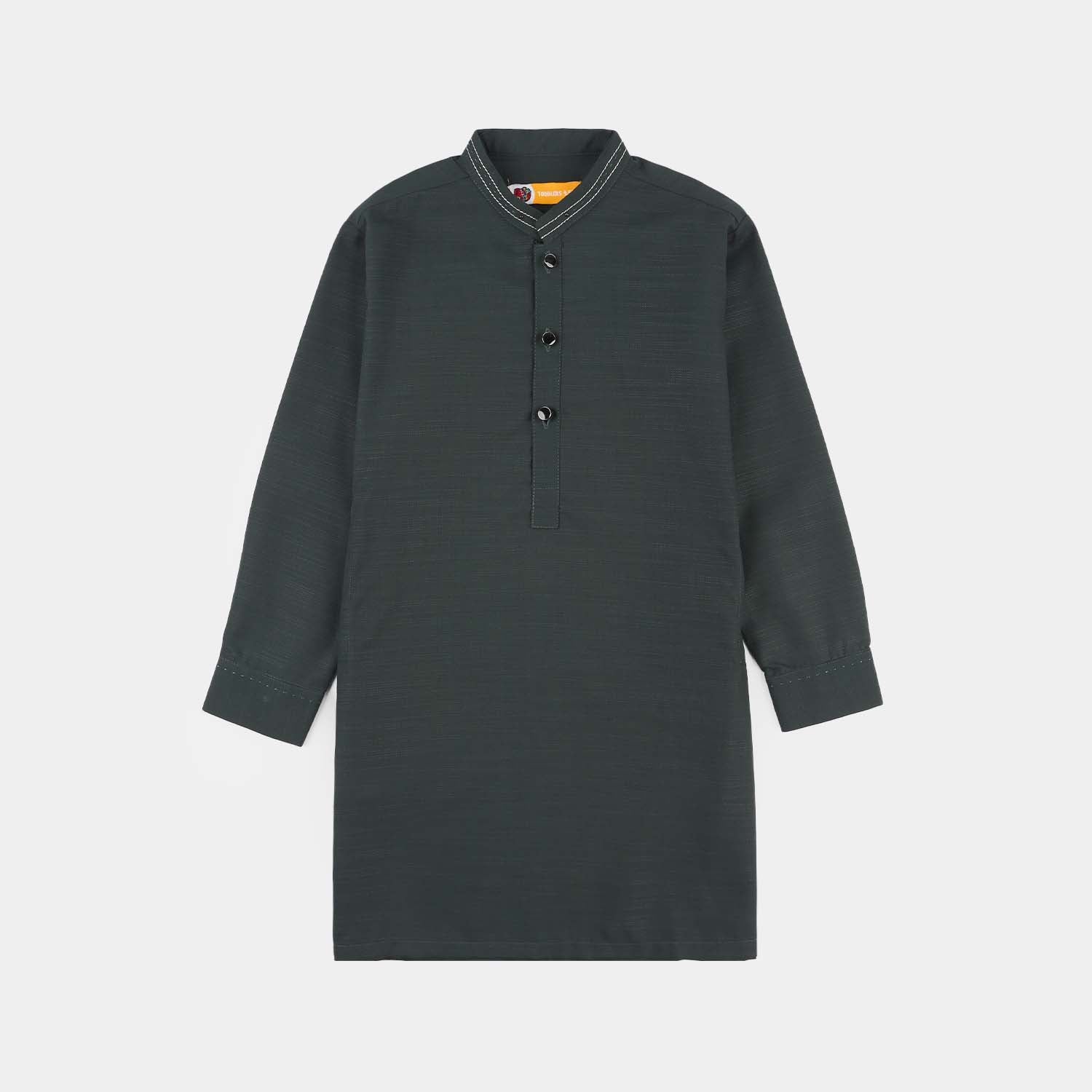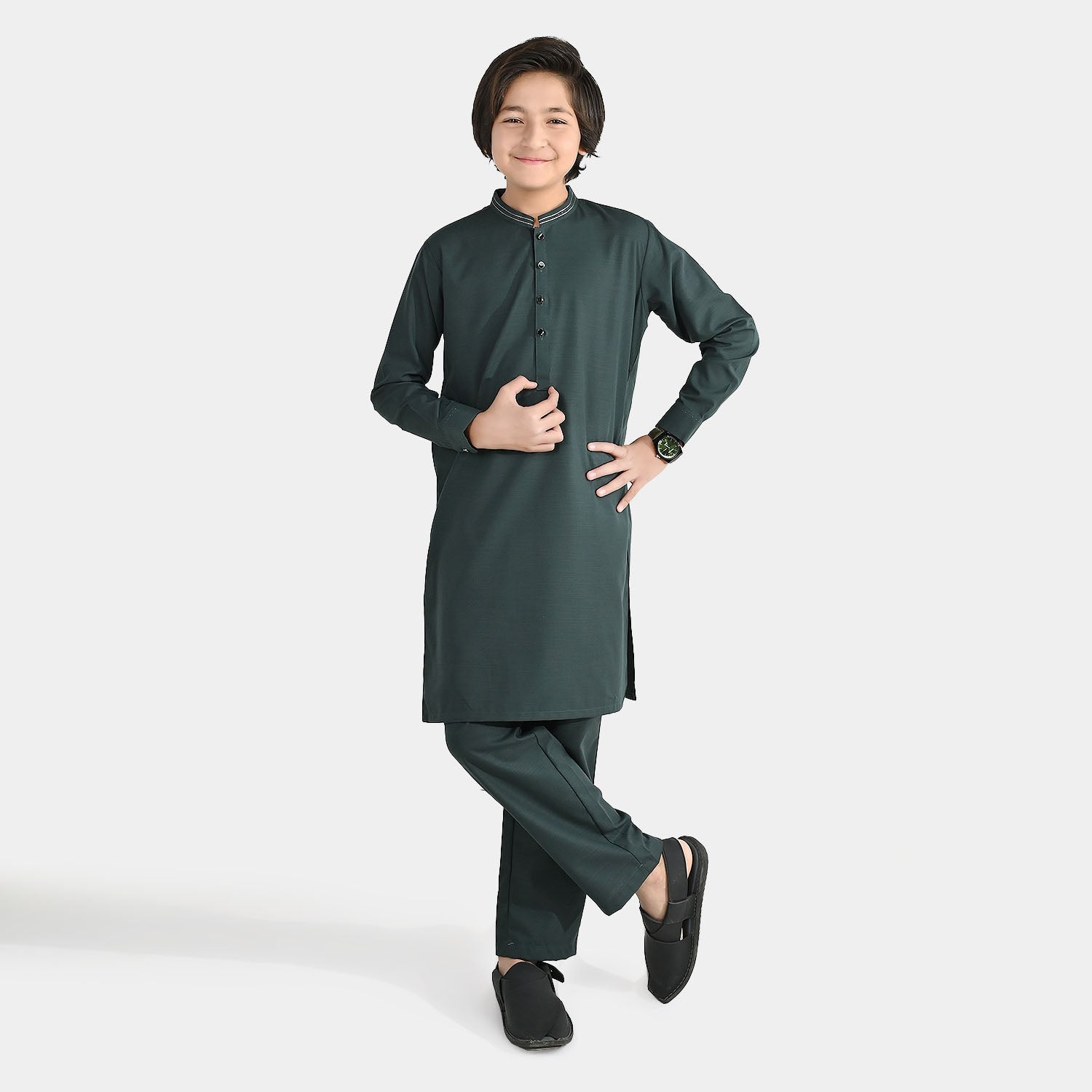 This teal green poly viscose shalwar suit for boys features an embroidered collar, full cuffed sleeves, and matching bottoms, perfect for a comfortable and stylish everyday look.