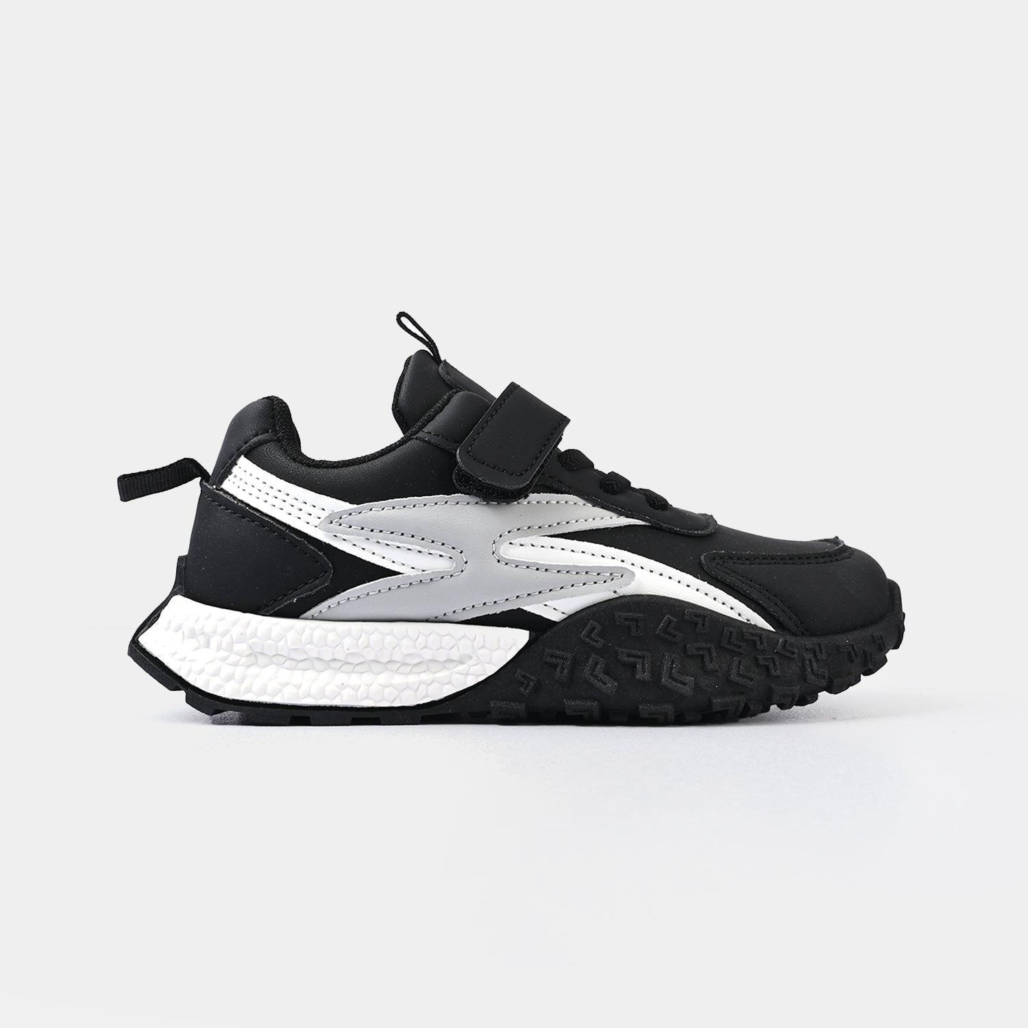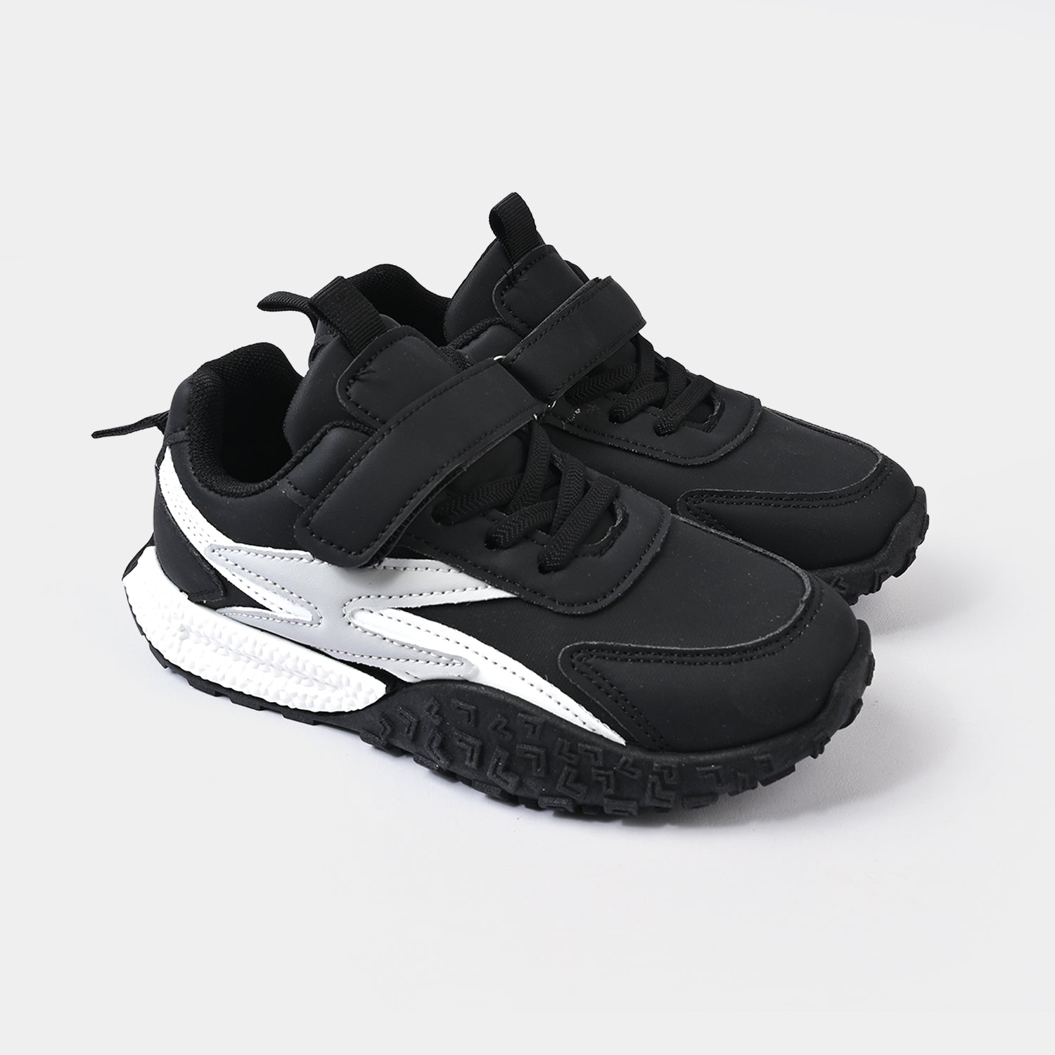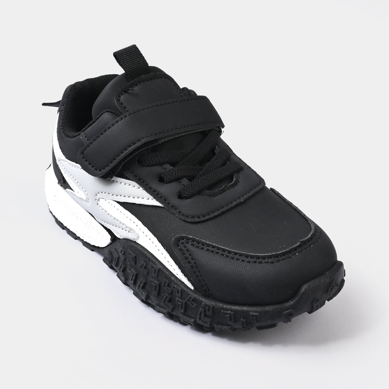 These black boys shoes feature a matte finish with white and grey side detailing, laces, and a strap for a secure, comfortable fit. Perfect for daily wear.