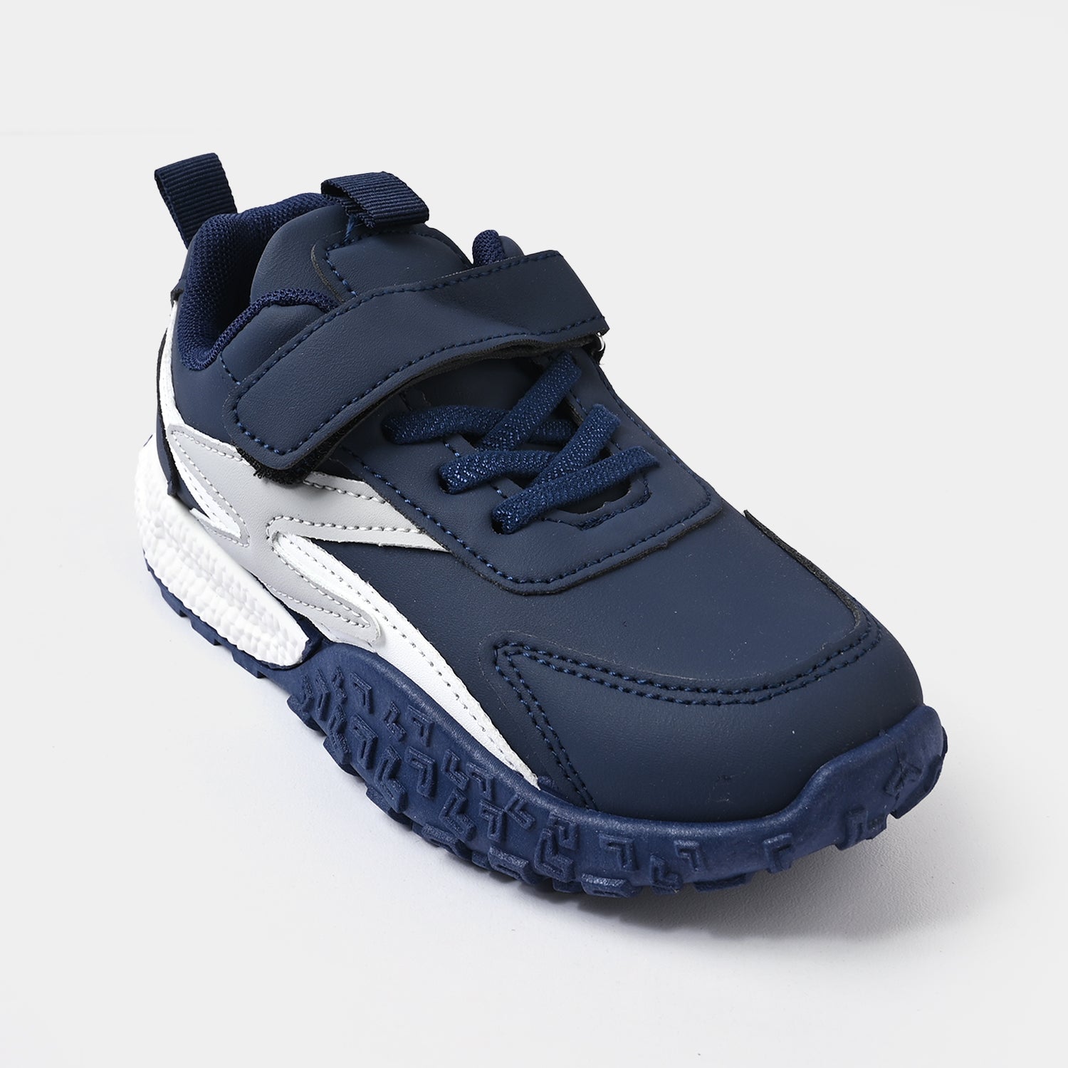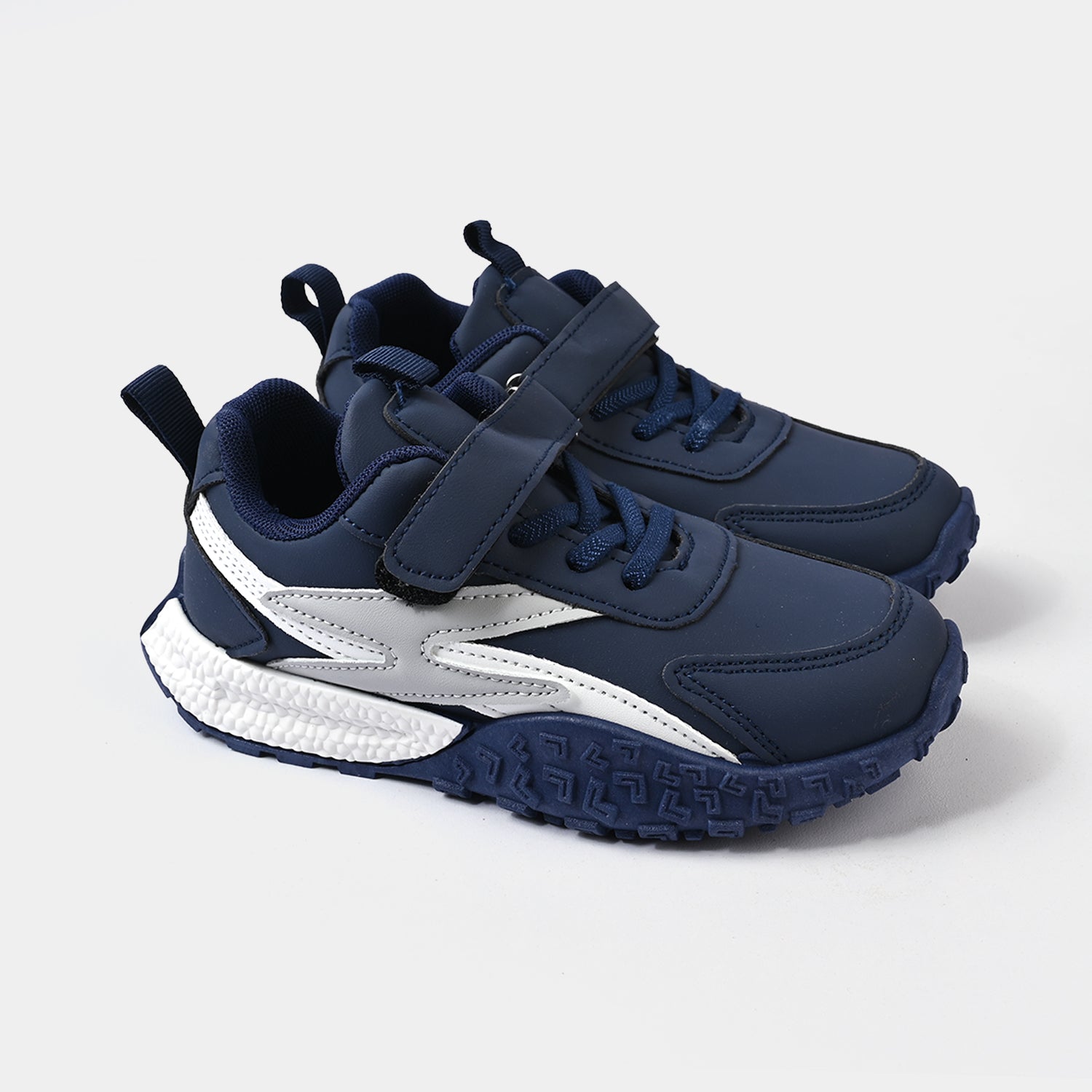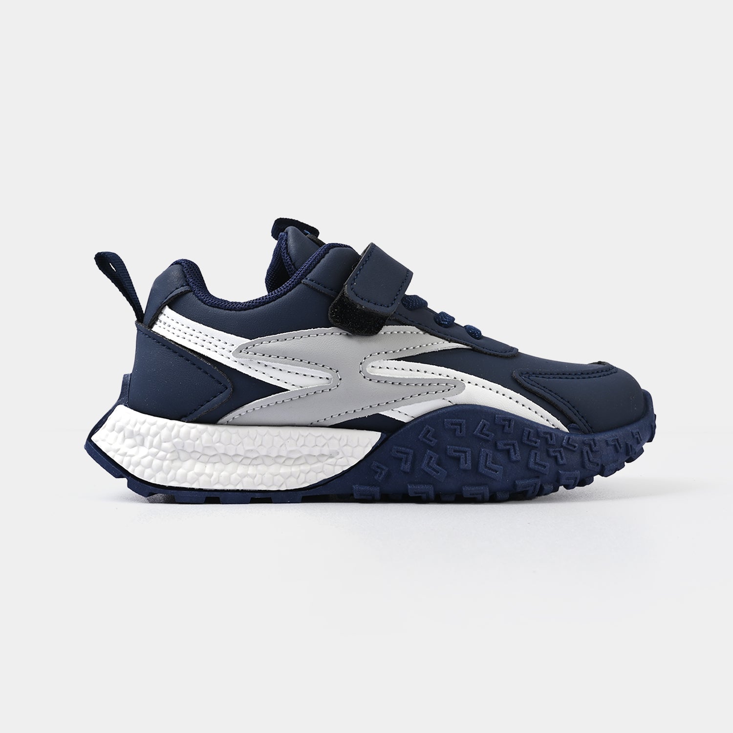 These blue boys shoes feature a matte finish with white and grey side detailing, laces and a strap for a secure, comfortable fit. Perfect for daily wear.