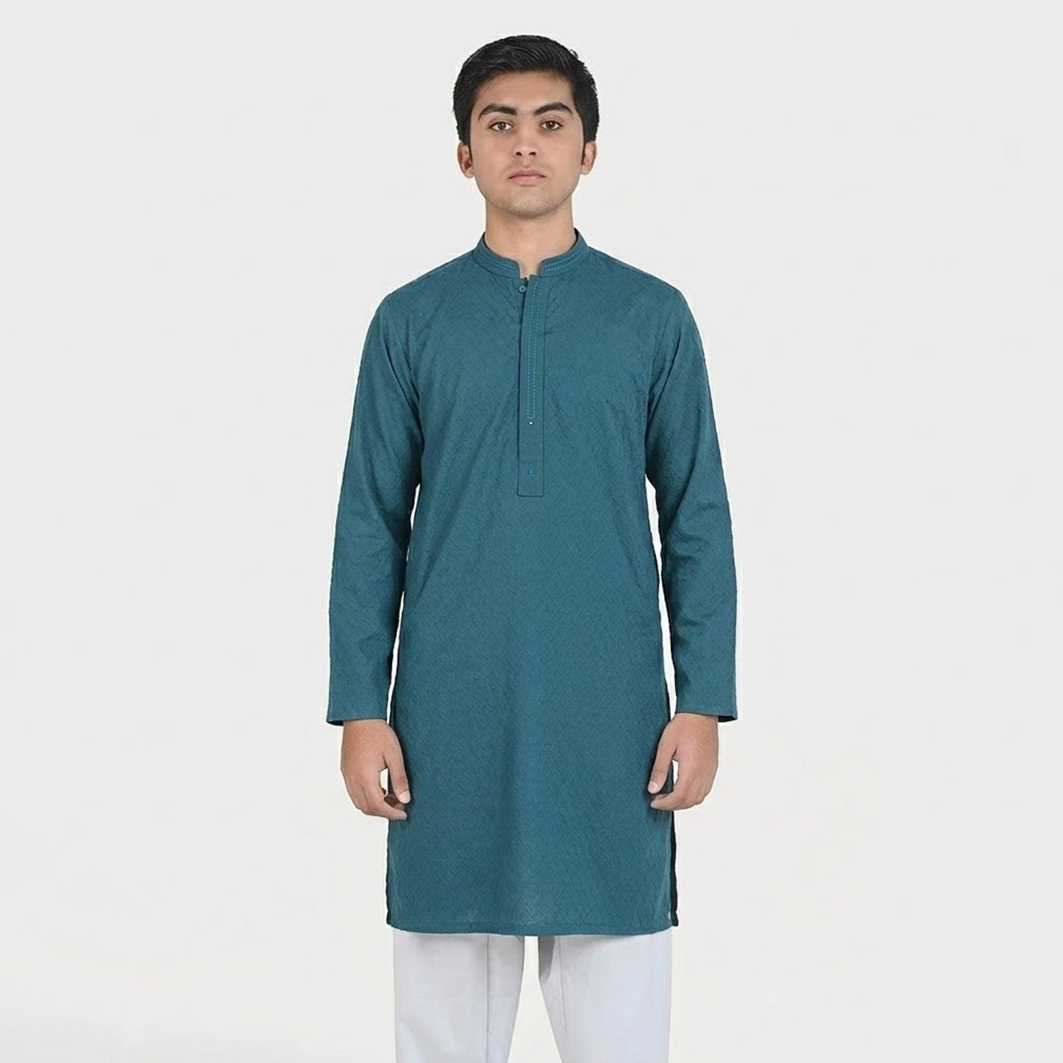 Teens boys' cotton jacquard basic kurta in teal featuring full sleeves, a round neck, and soft breathable fabric, perfect for festive occasions and casual outings.