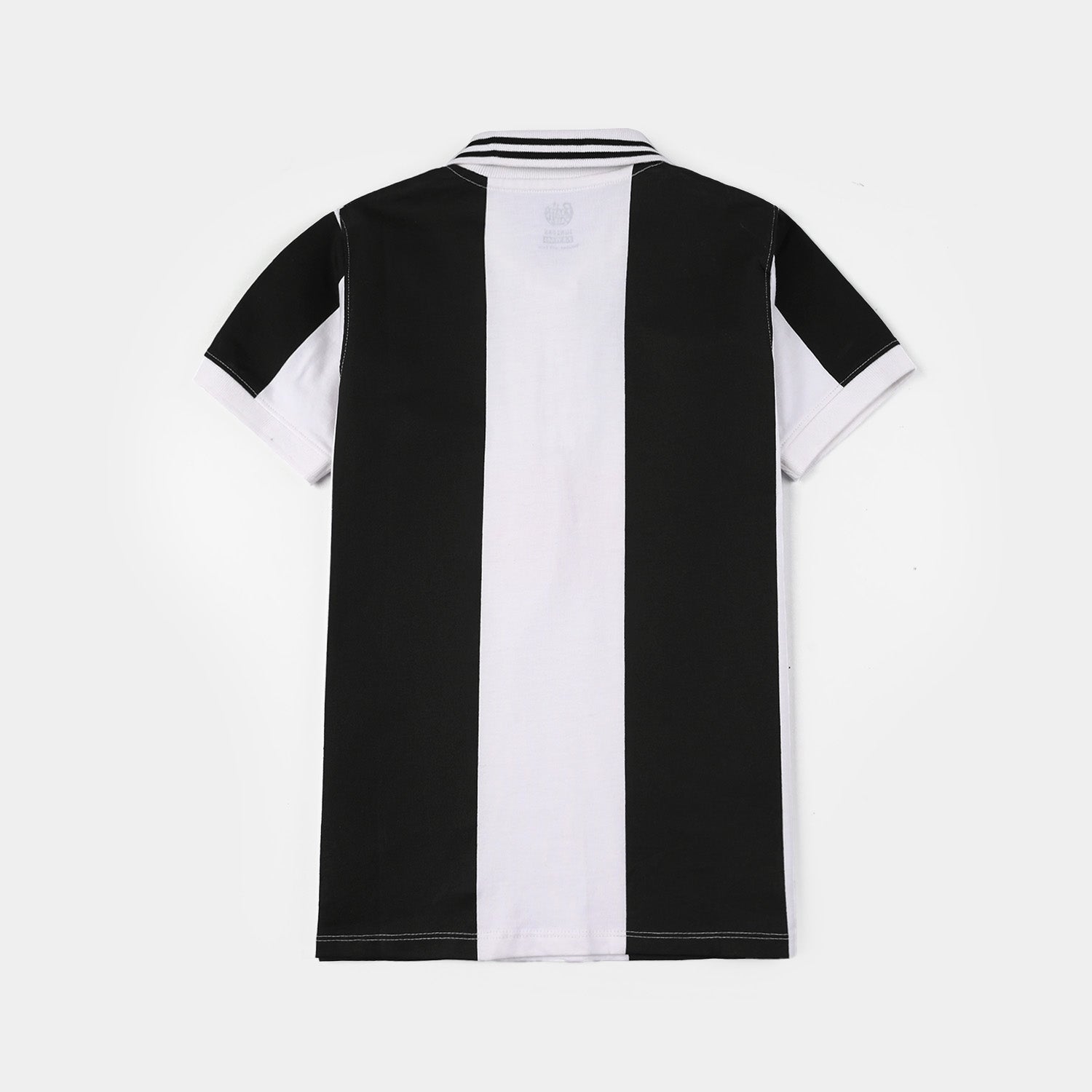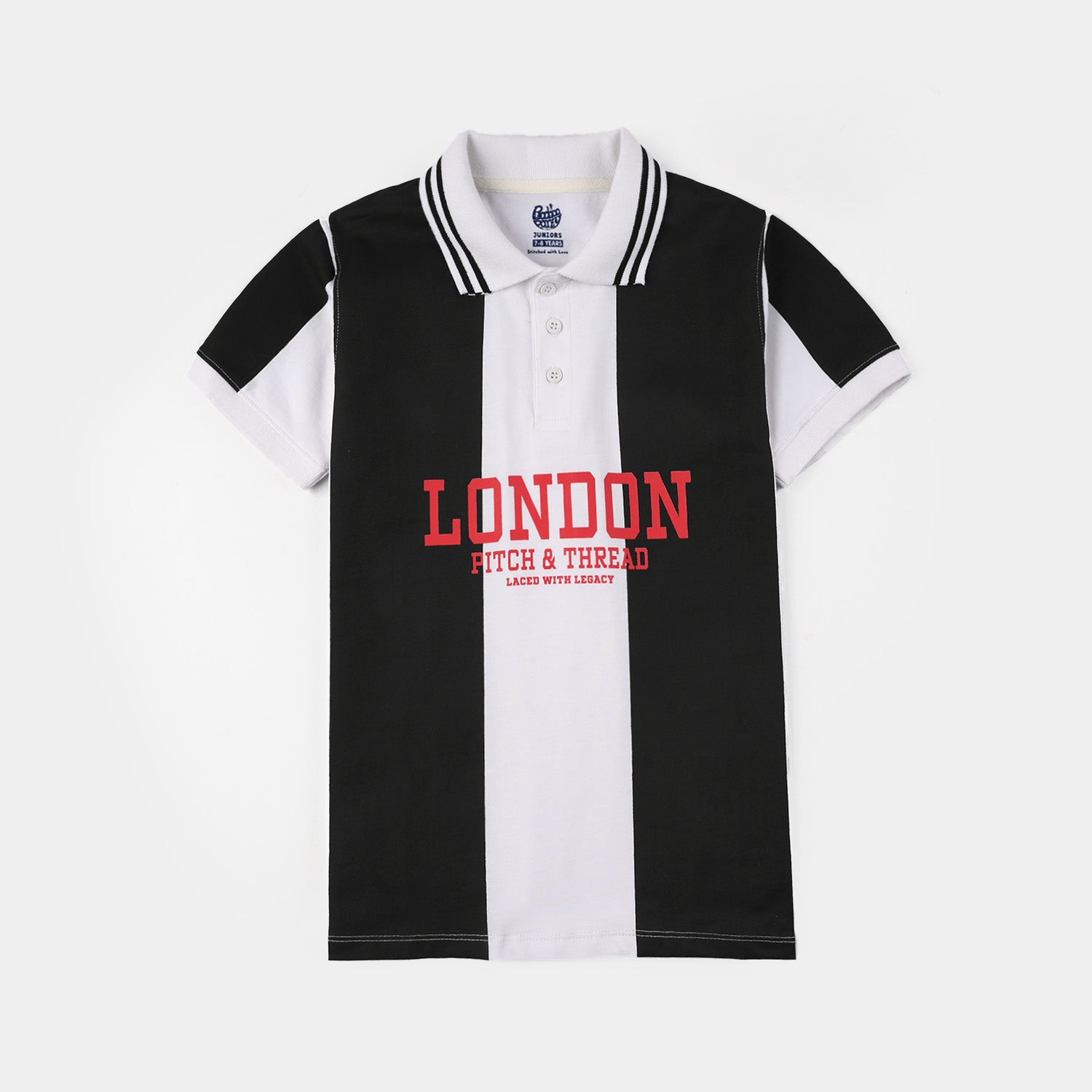 This white and black striped jersey/terry polo for boys features a collar, half sleeves, and “London” text on the front, perfect for a smart and comfortable everyday look.
