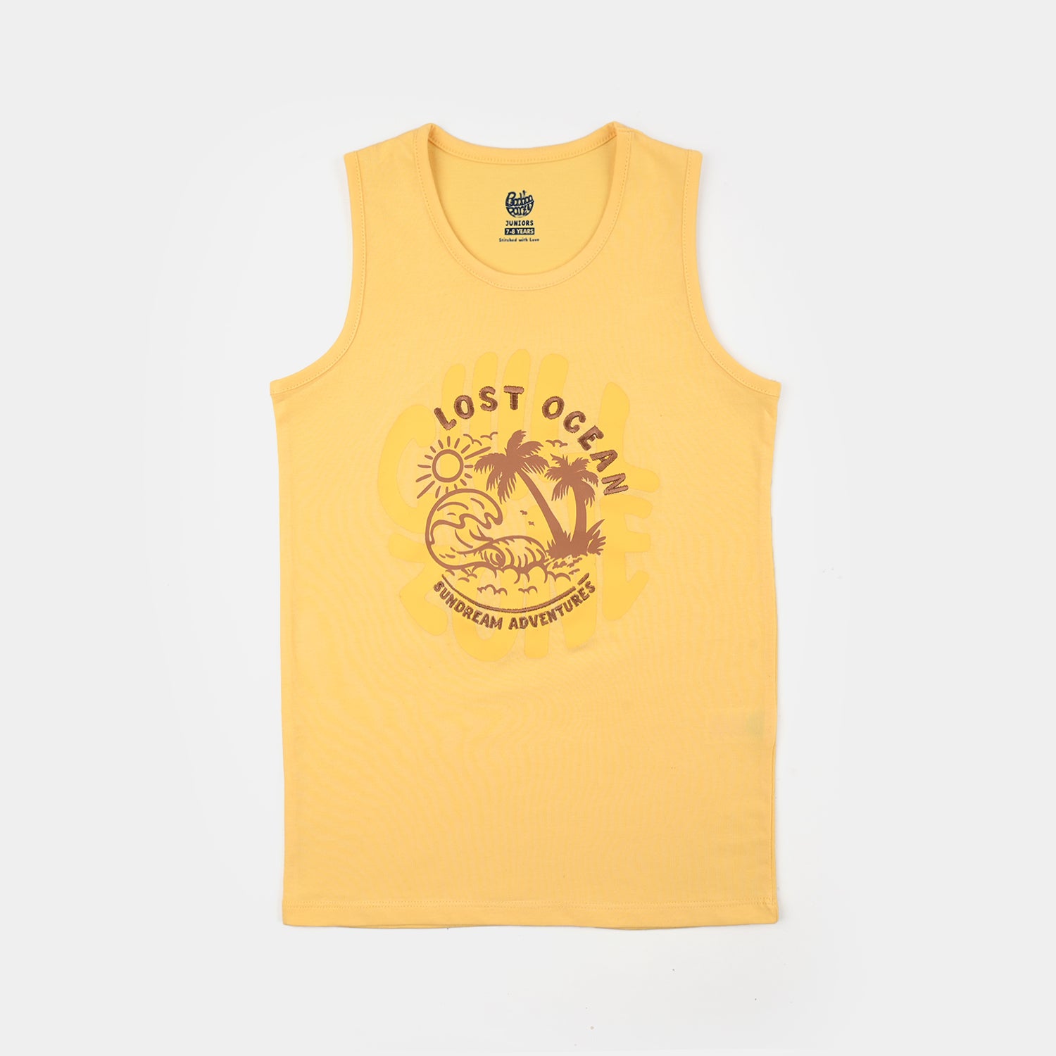 Boys’ yellow jersey/terry sando with front printed graphic for a casual, summery look.