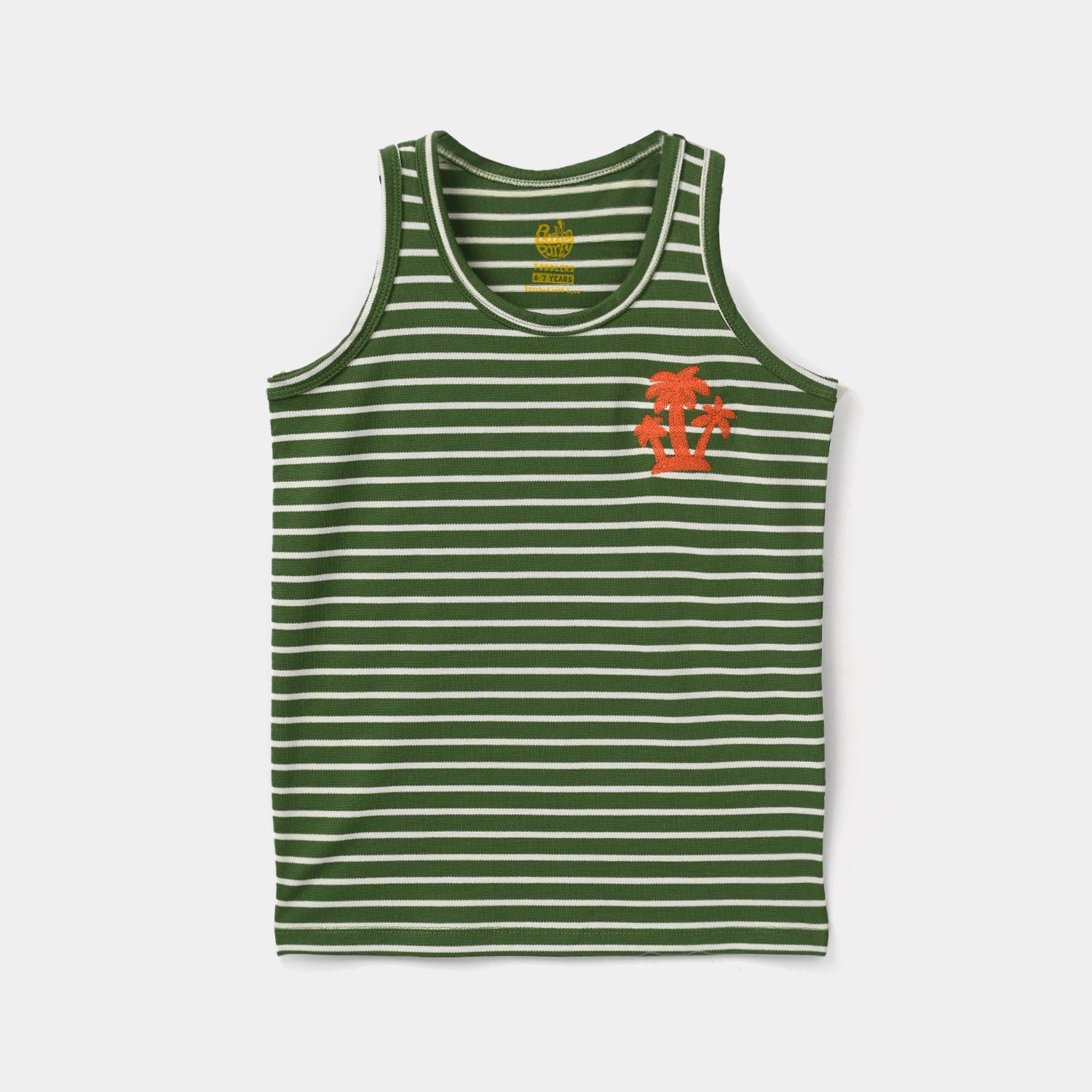 Boys’ green jersey/terry sando with a striped pattern and palm tree design for a casual, summery look.