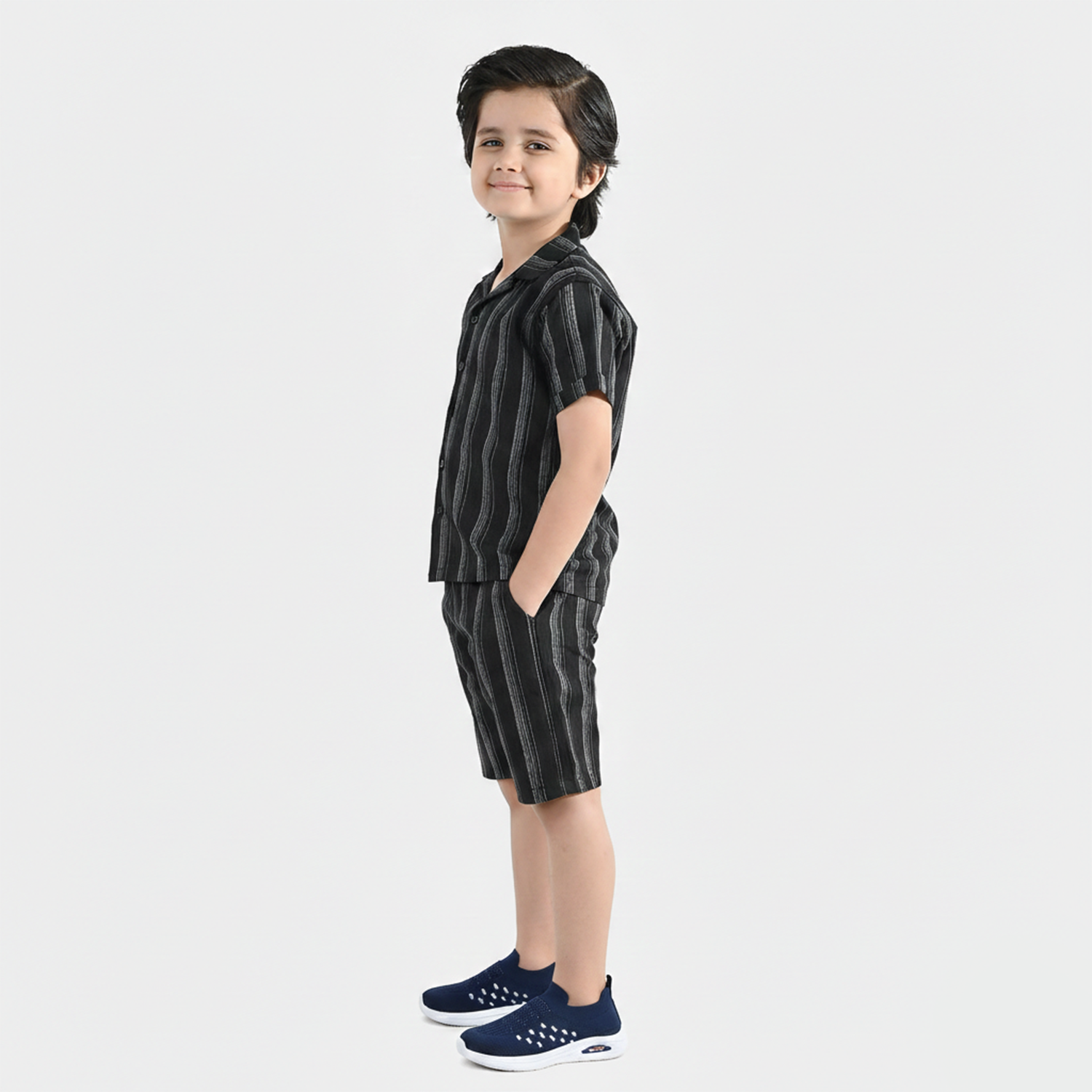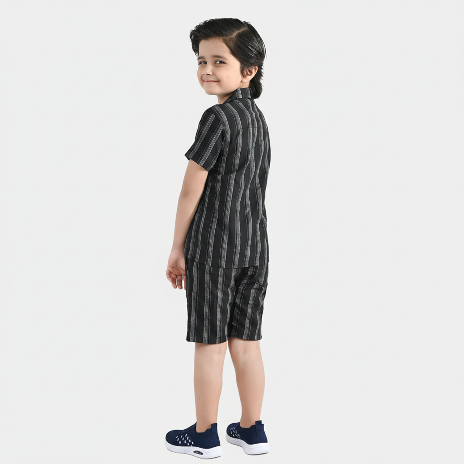 Boys black yarn-dyed woven suit featuring a striped design, half sleeves, button-down style, and matching shorts, perfect for festive occasions or daily wear.