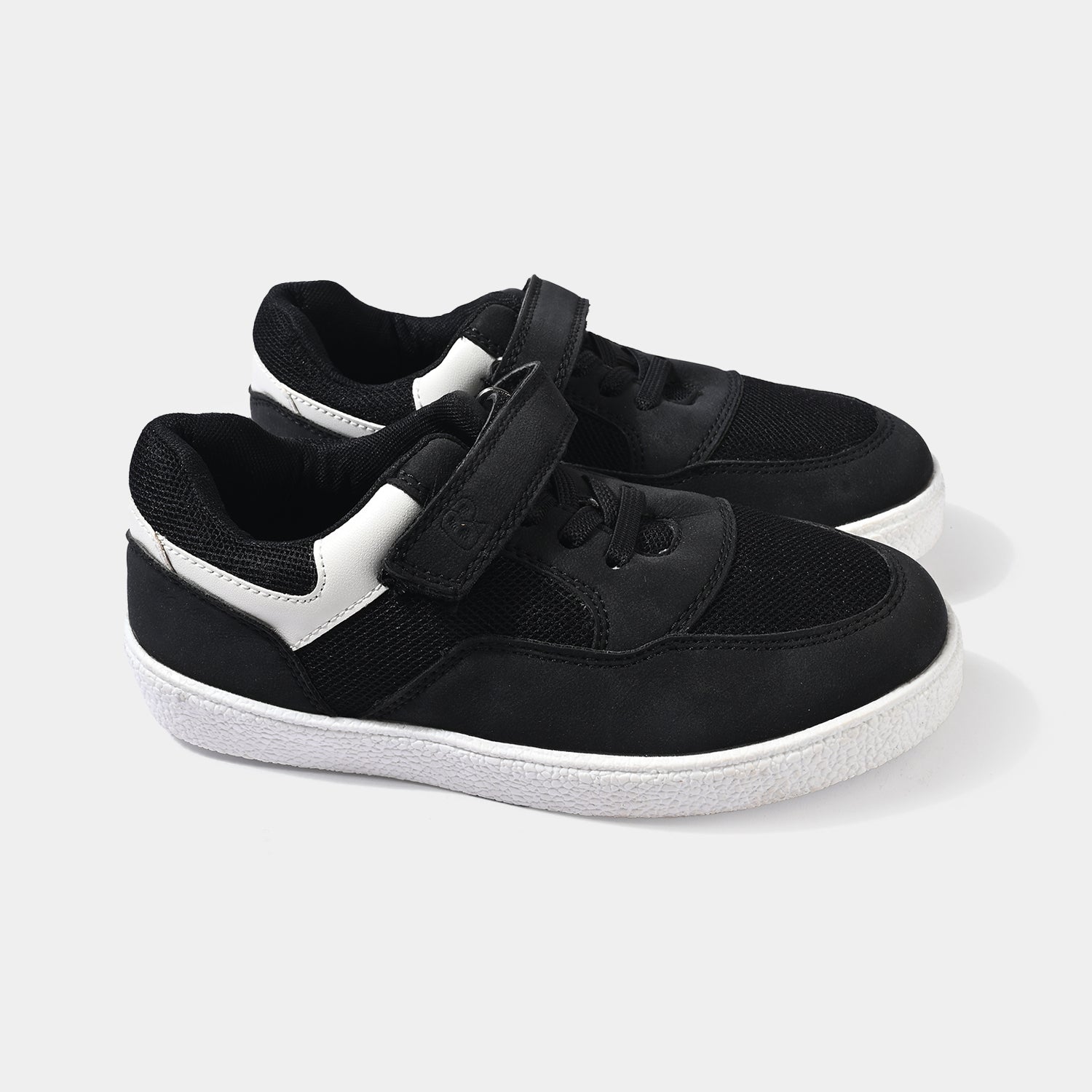 Black boys’ sneakers with mesh and suede, white side accent, velcro straps, and textured rubber sole stylish, comfy, and perfect for everyday wear.