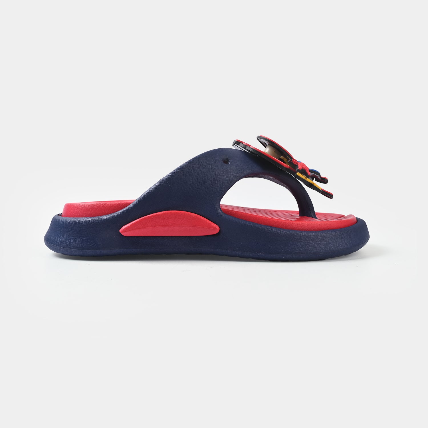 Boys’ rubber slippers in navy featuring a flip-flop style design and Spiderman embellishment on top, perfect for fun and comfortable everyday wear.