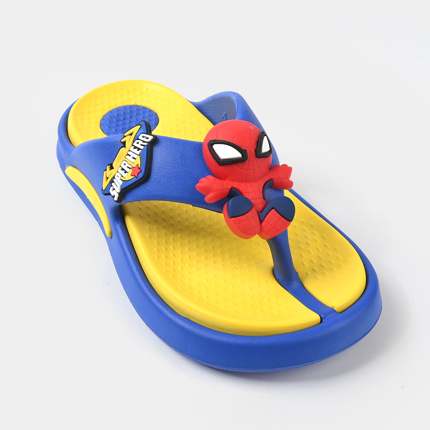 Boys’ rubber slippers in blue featuring a flip-flop style design and Spiderman embellishment on top, perfect for fun and comfortable everyday wear.