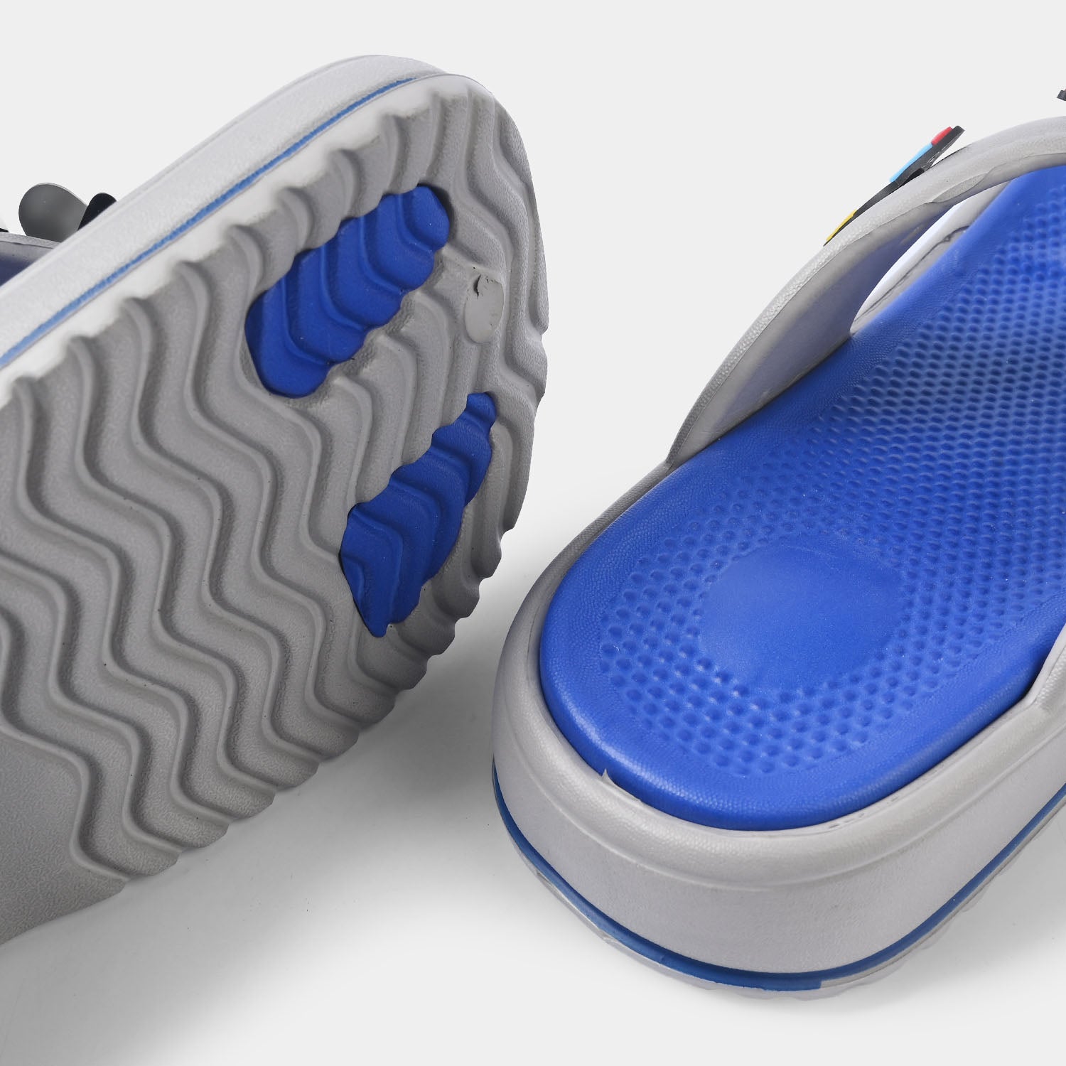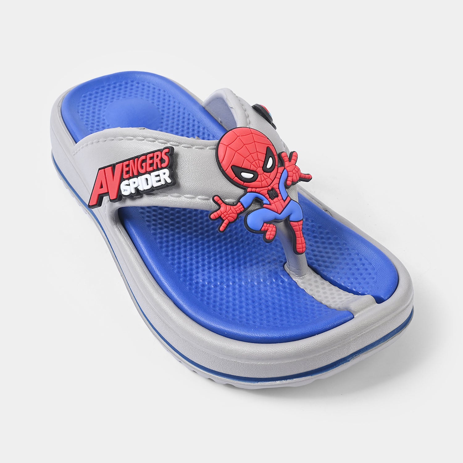Boys slippers in grey featuring a flip-flop style design and Spiderman embellishment on top, perfect for fun and comfortable everyday wear.