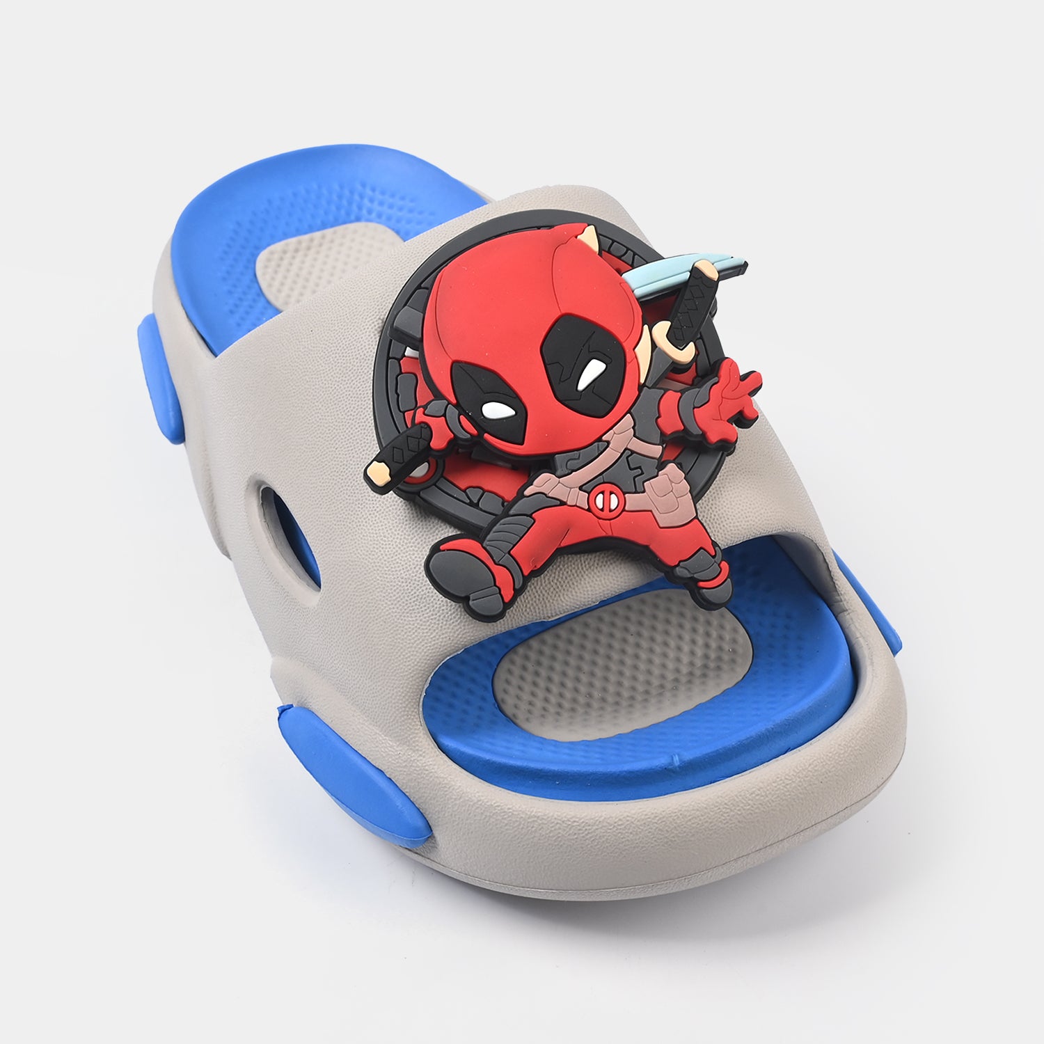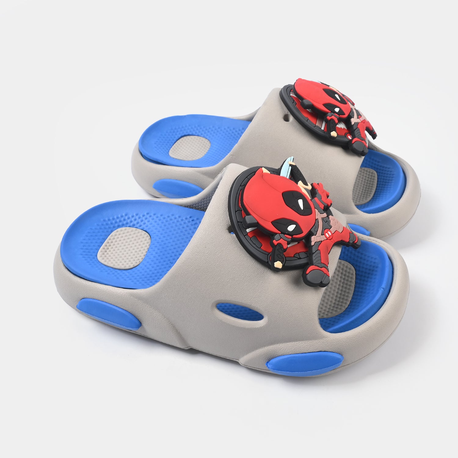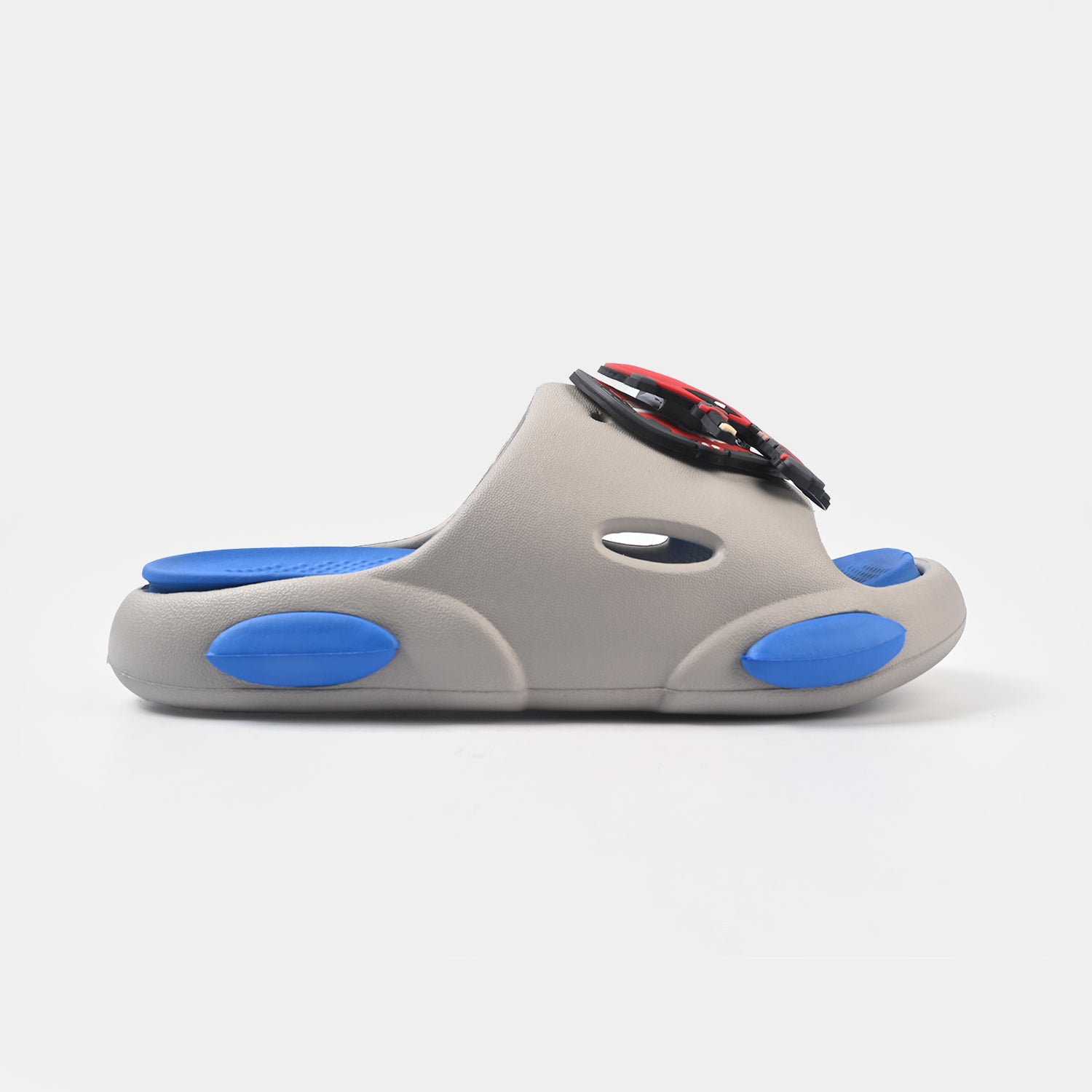 Boys' slippers in grey and blue featuring a Spiderman theme, slip-on style, and cushioned sole, perfect for a comfortable and playful everyday look.