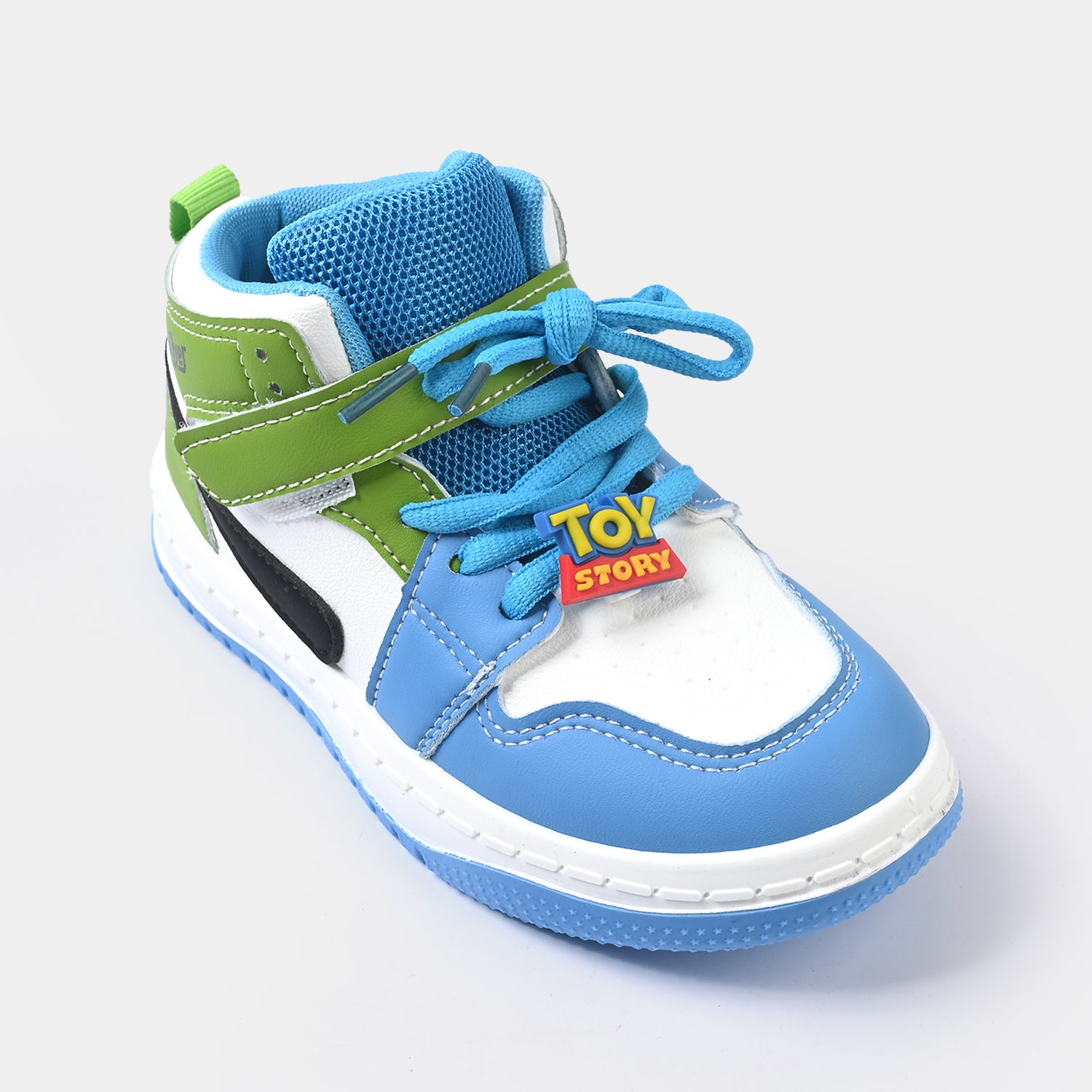 Boys’ sneakers in blue, green, black, and white featuring lace-up closure, green strap detail, contrast design panels, and toy sneaker embellishment, perfect for a fun and comfortable everyday look.