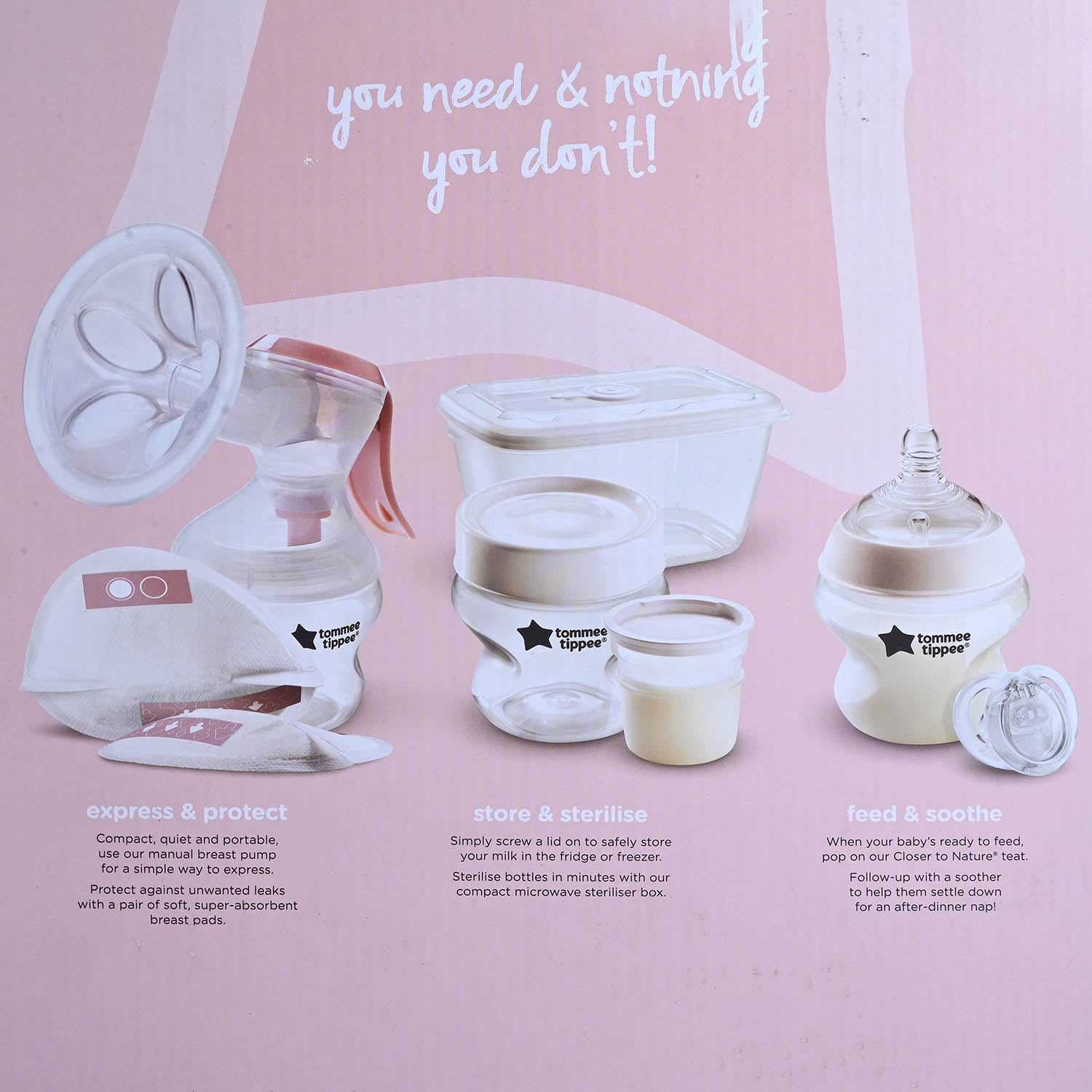 Includes teats and protective caps. |