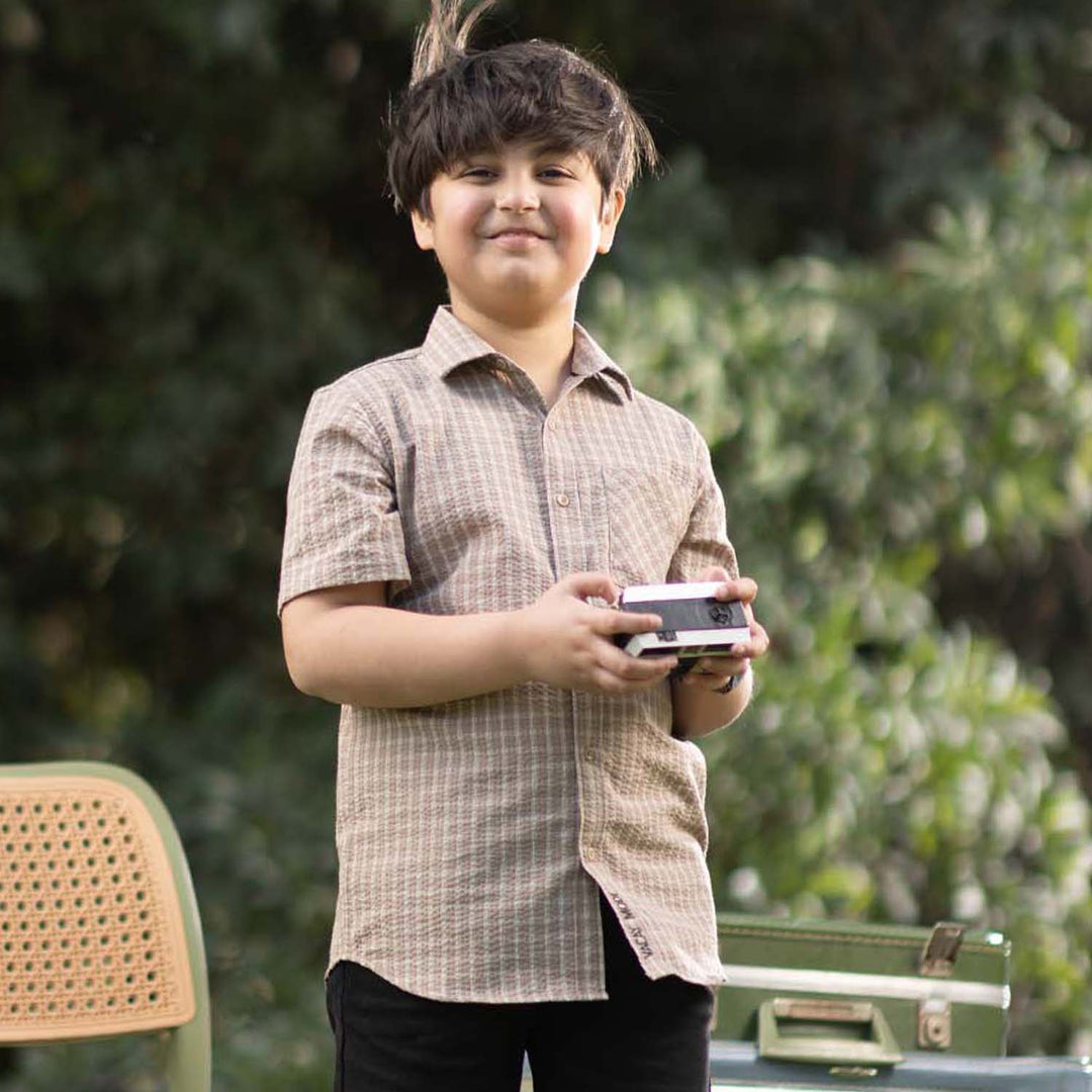 Boys Yarn Dyed Shirt H/S (Choco Lines) - Beige Stripes
