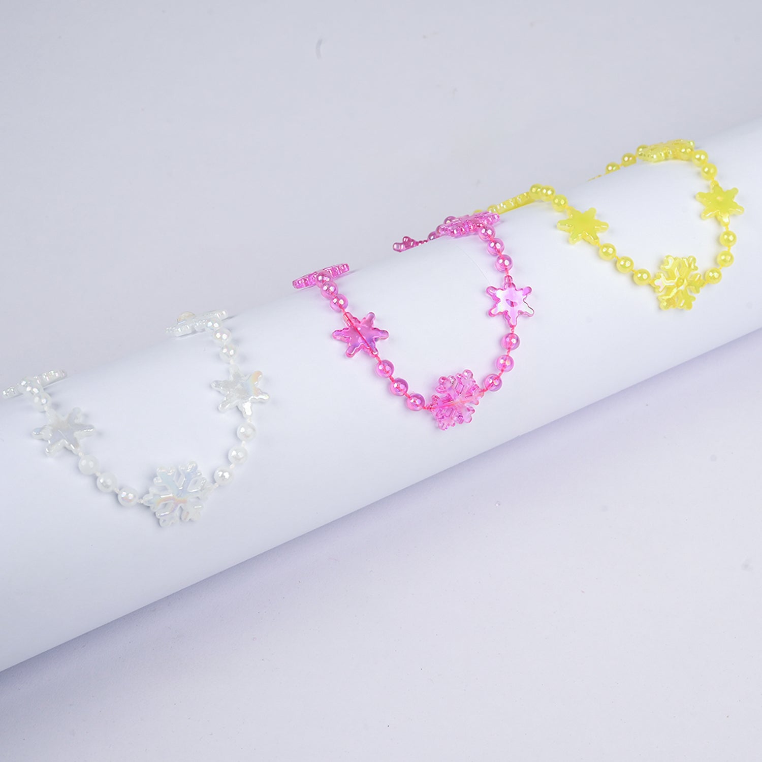 These sweet pastel necklaces feature delicate snowflake-shaped beads in soft white, purple, and yellow. Lightweight and charming, they add a gentle pop of color and a cute, playful vibe to any outfit.