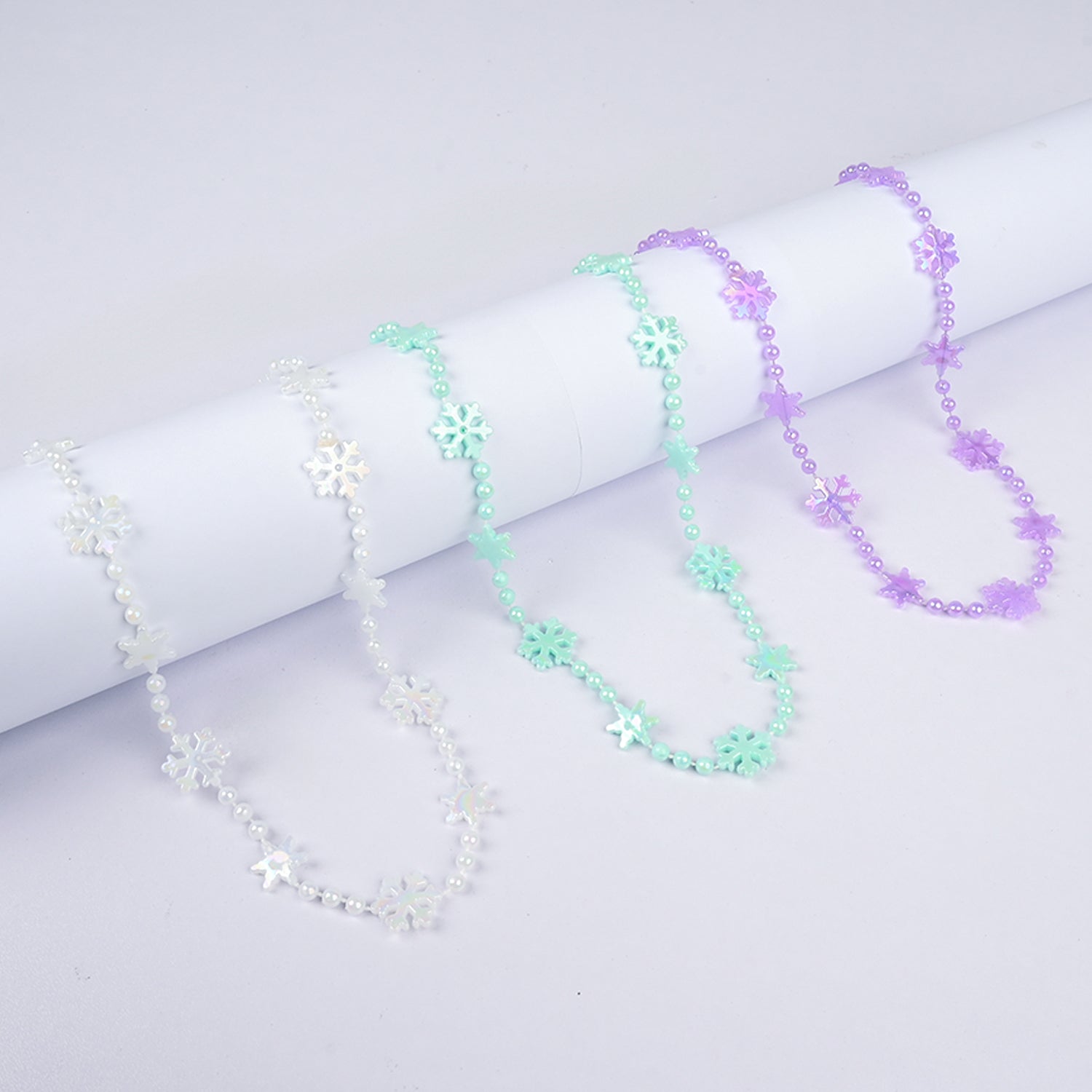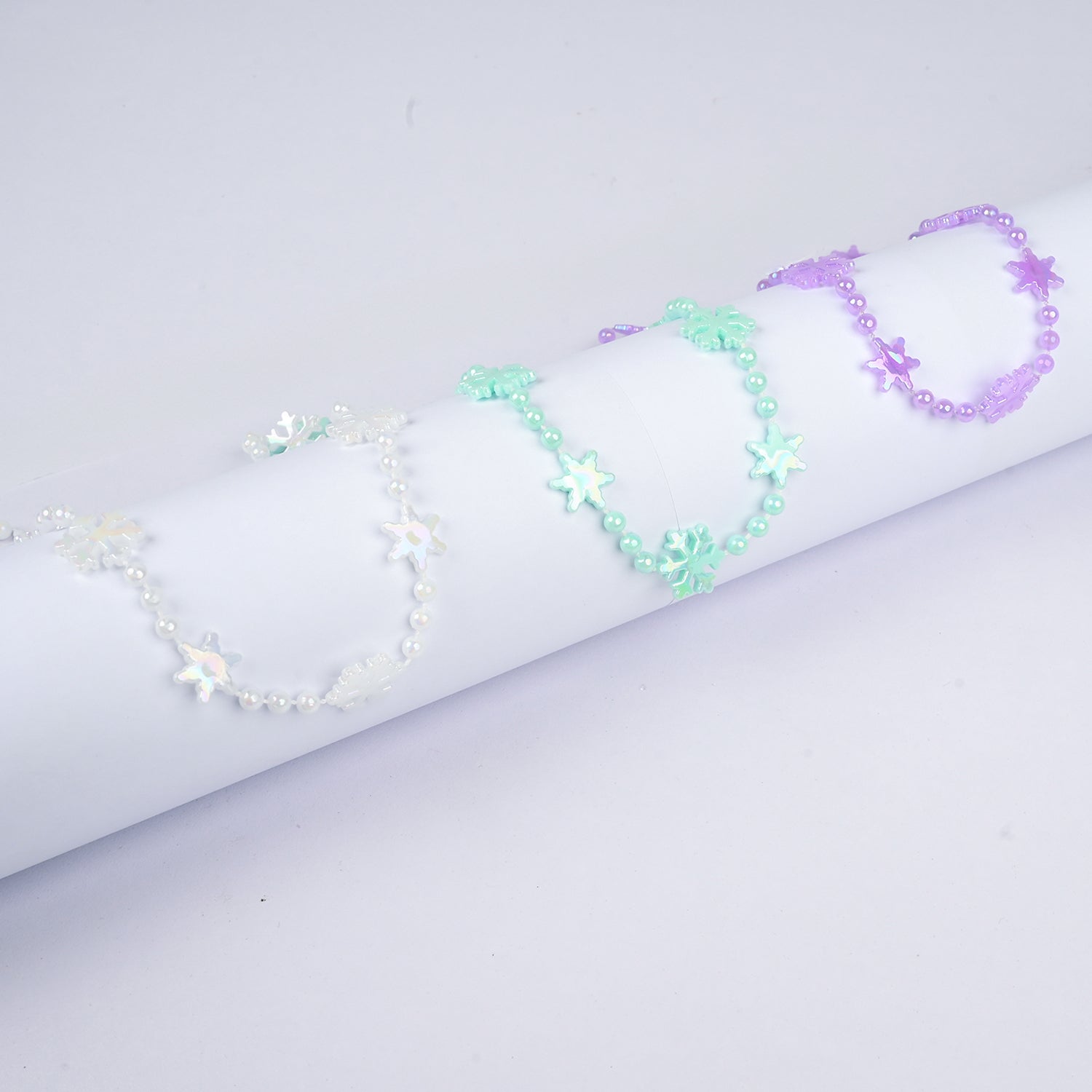 These sweet pastel necklaces feature delicate snowflake-shaped beads in soft white, mint, and lavender. Lightweight and charming, they add a gentle pop of color and a cute, playful vibe to any outfit.