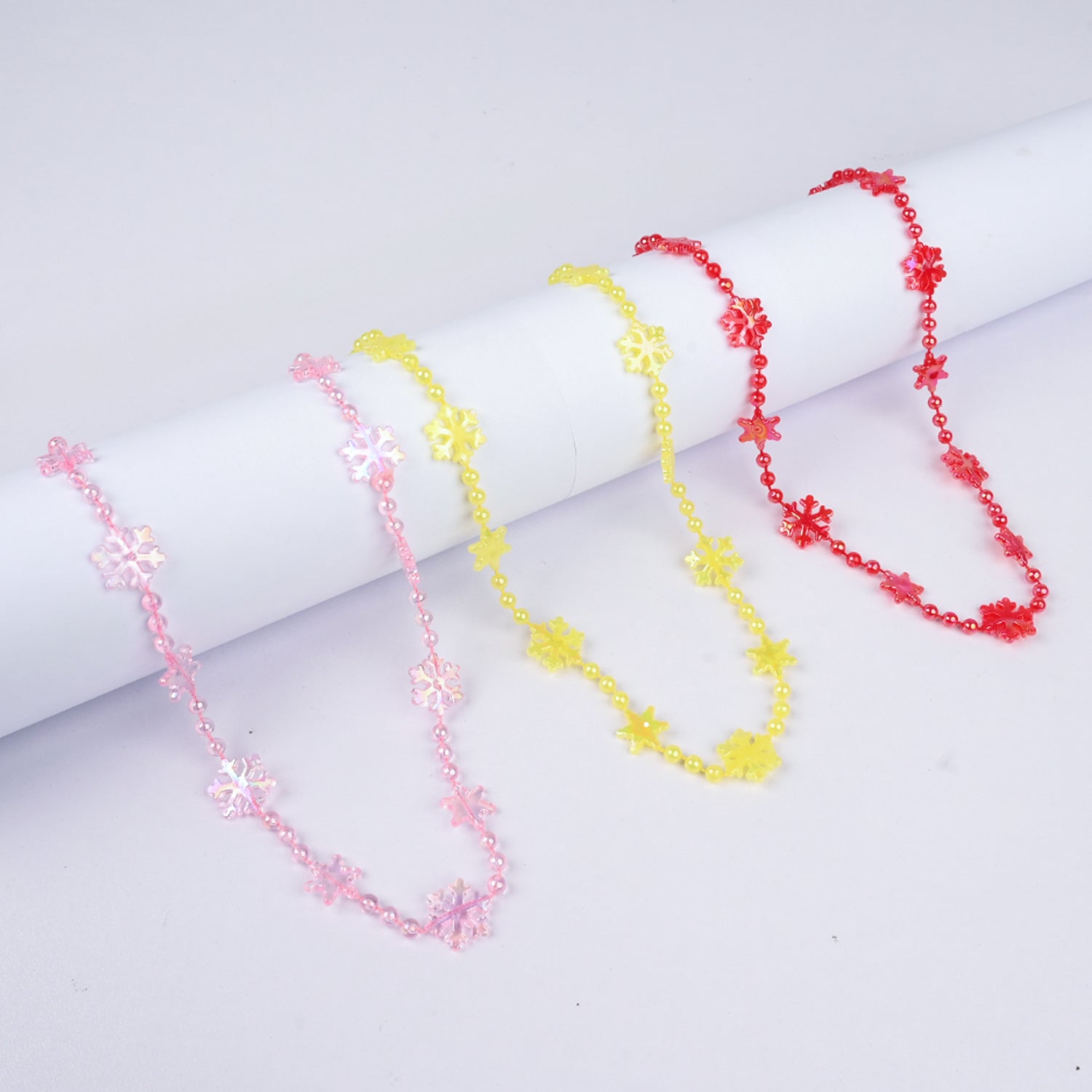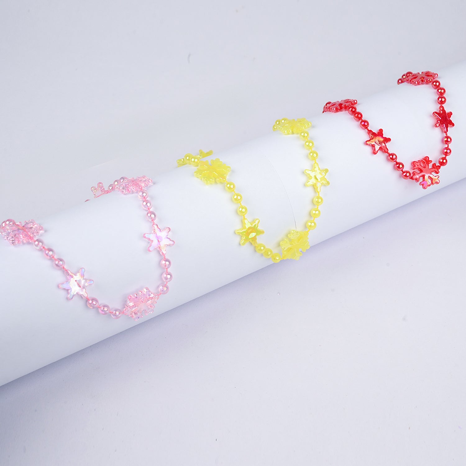 These sweet pastel necklaces feature delicate snowflake-shaped beads in soft pink, red, and yellow. Lightweight and charming, they add a gentle pop of color and a cute, playful vibe to any outfit.