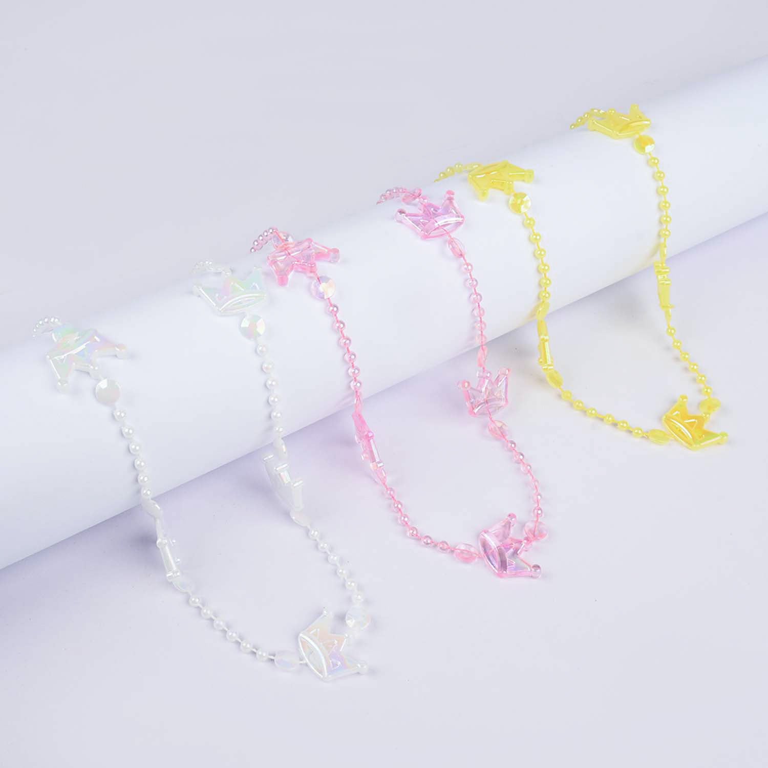 Complete your little one’s look with this crown-shaped necklace in yellow, pink, and white, perfect for everyday or special occasions.