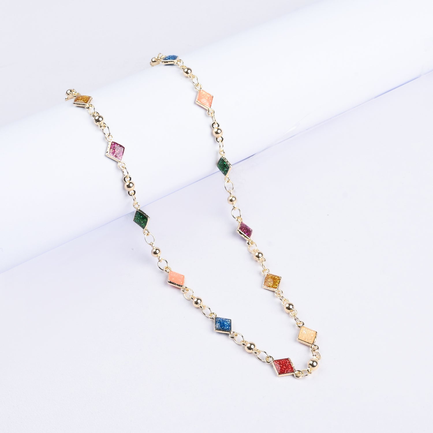 Brighten up your child’s look with this vibrant, multicolored necklace featuring a golden chain and playful, colorful elements. Lightweight, stylish, and comfortable to wear, it’s perfect for parties, daily outfits, and gifting young accessory lovers.
