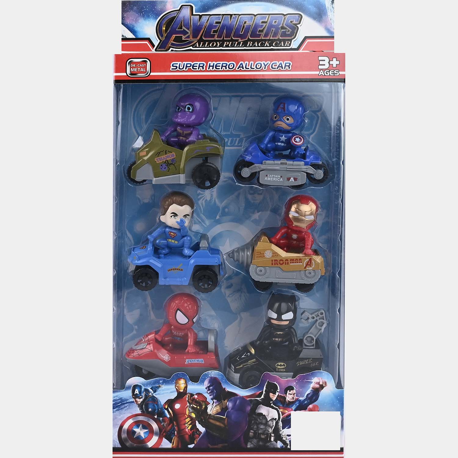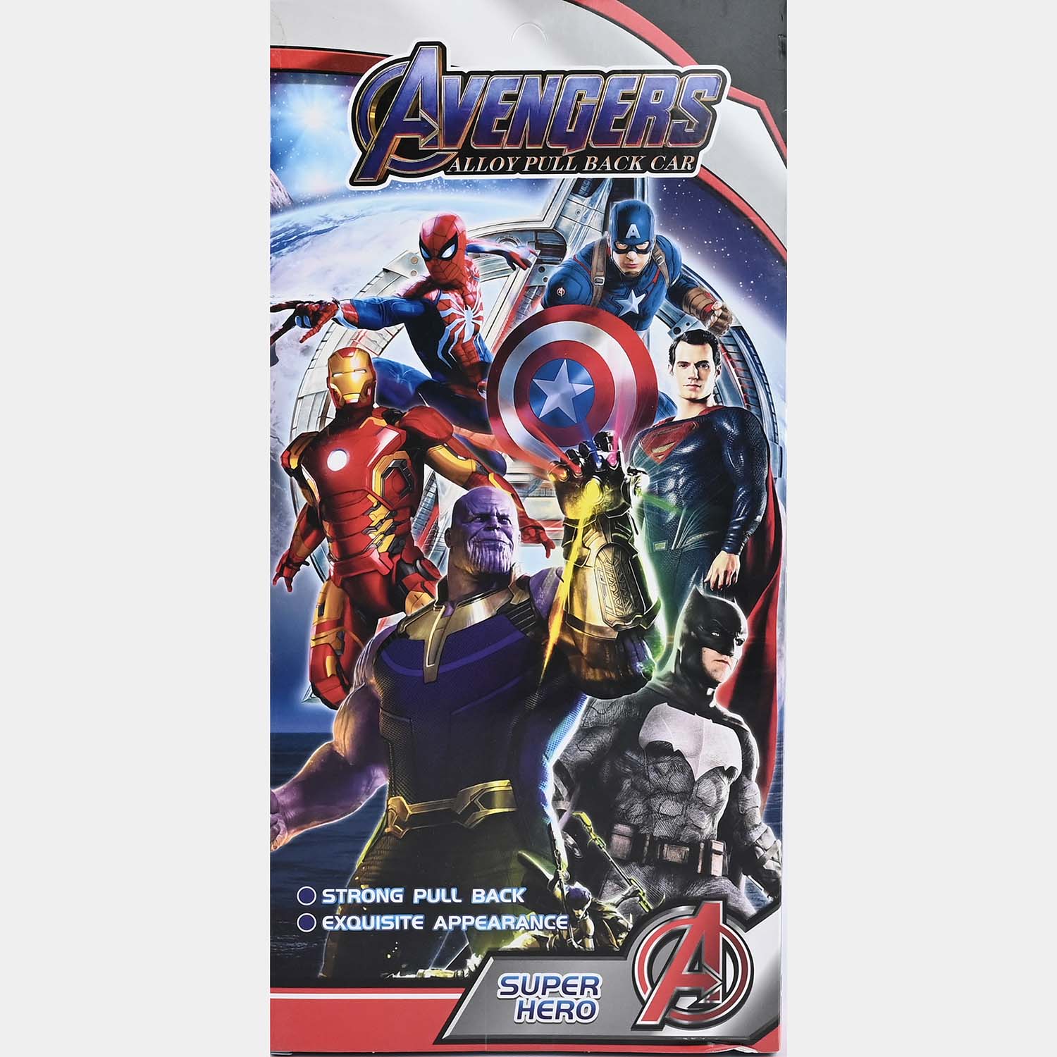 Die-cast superhero cars with pull-back action featuring Batman, Iron Man, Spider-Man, and Captain America. Made from durable alloy metal, each car zooms forward without batteries. Perfect for imaginative play and superhero adventures.