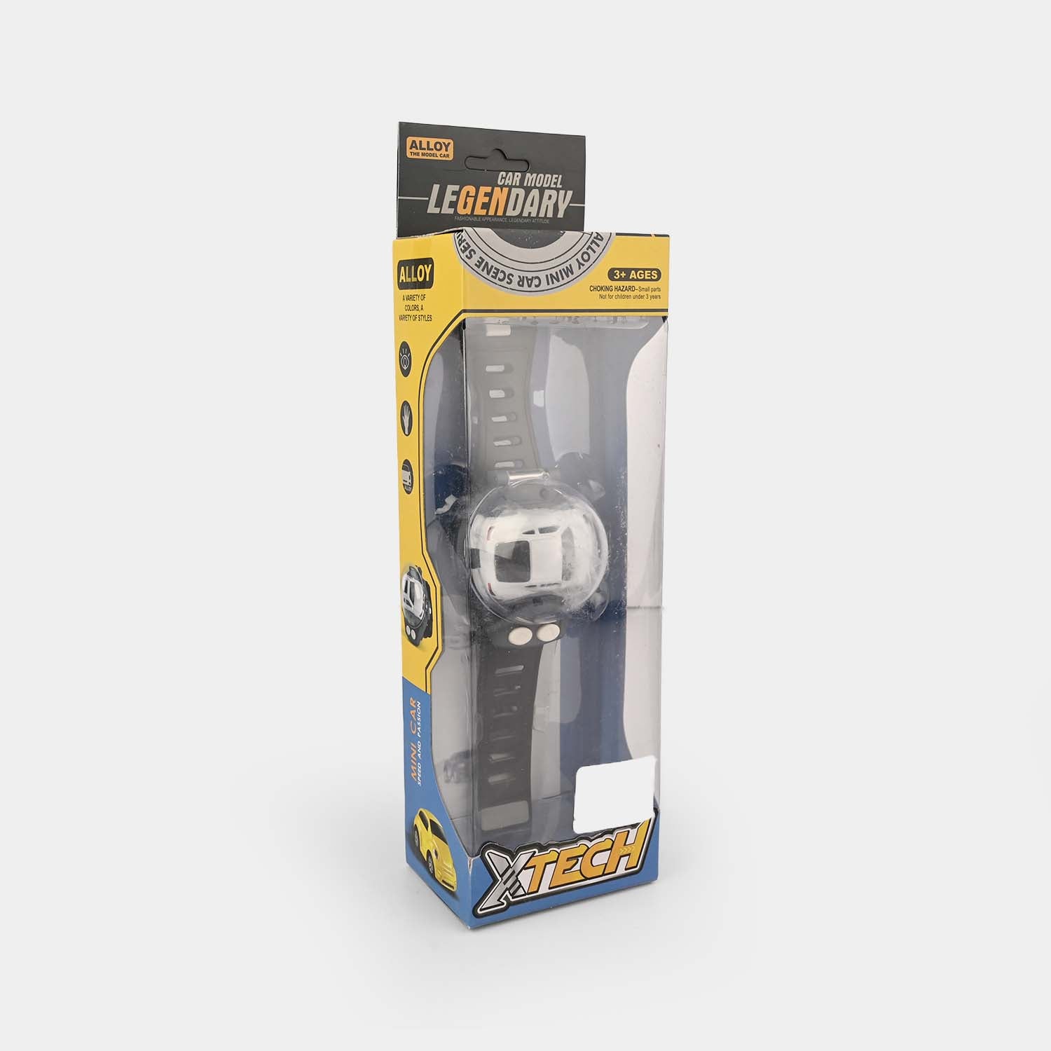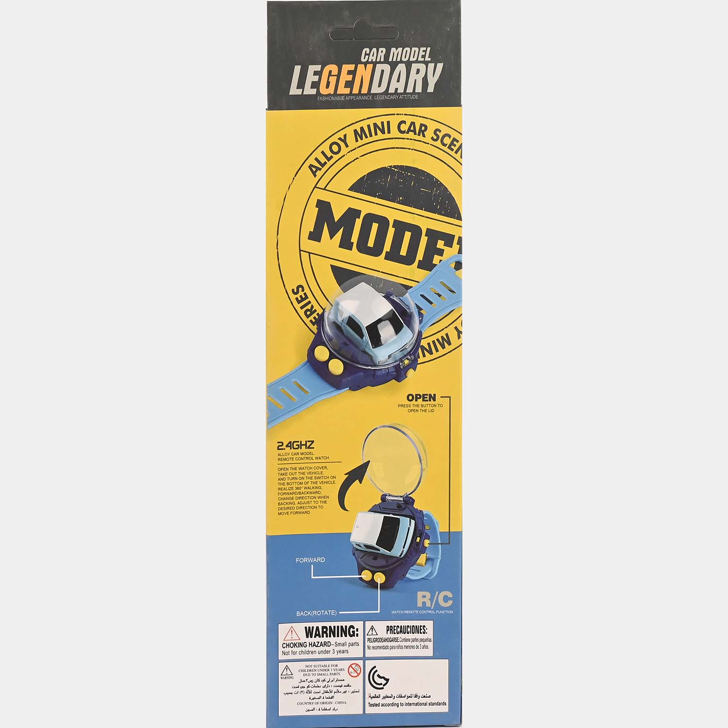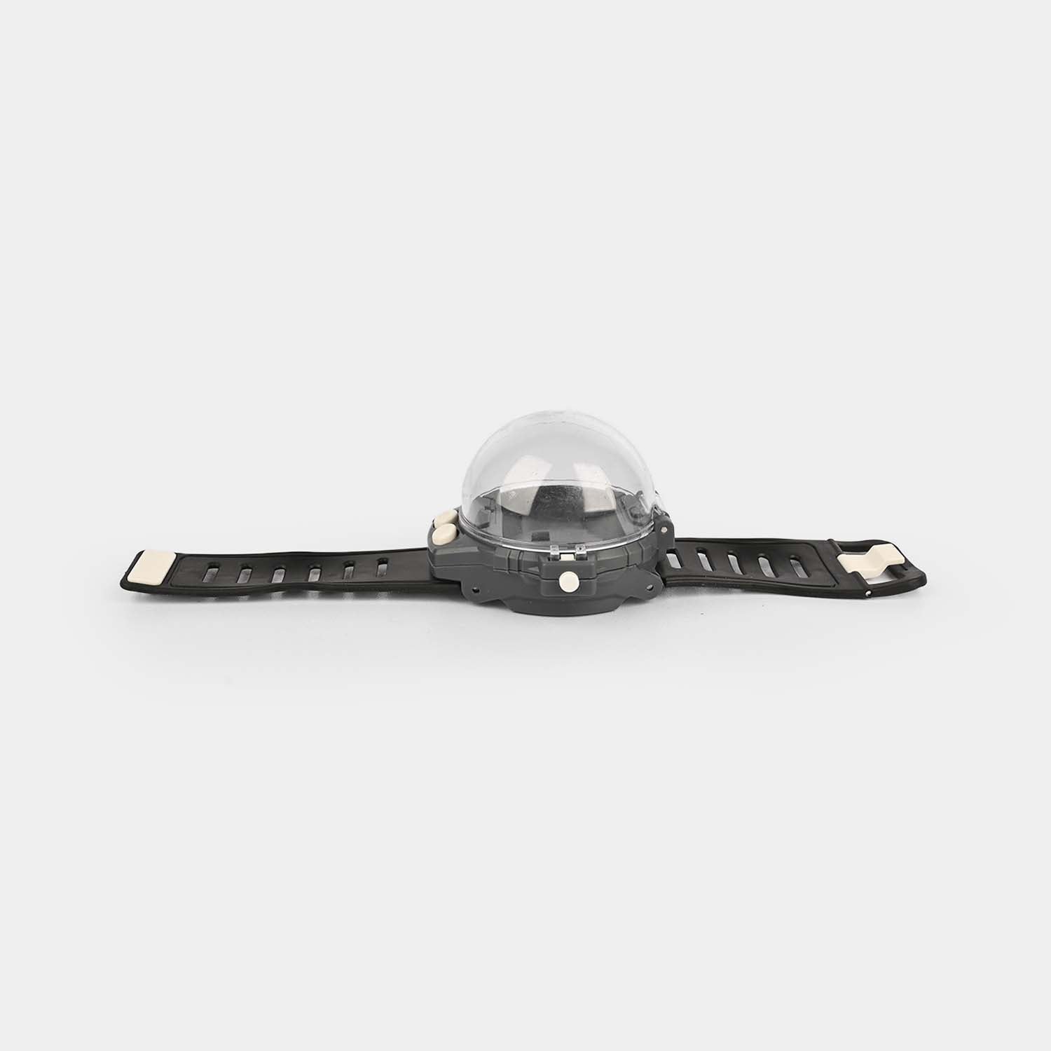 This Watch Remote Control Toy Car has a silicone wrist strap and two buttons for different functions. The right button moves the car in a circle while the left button moves the vehicle ahead.