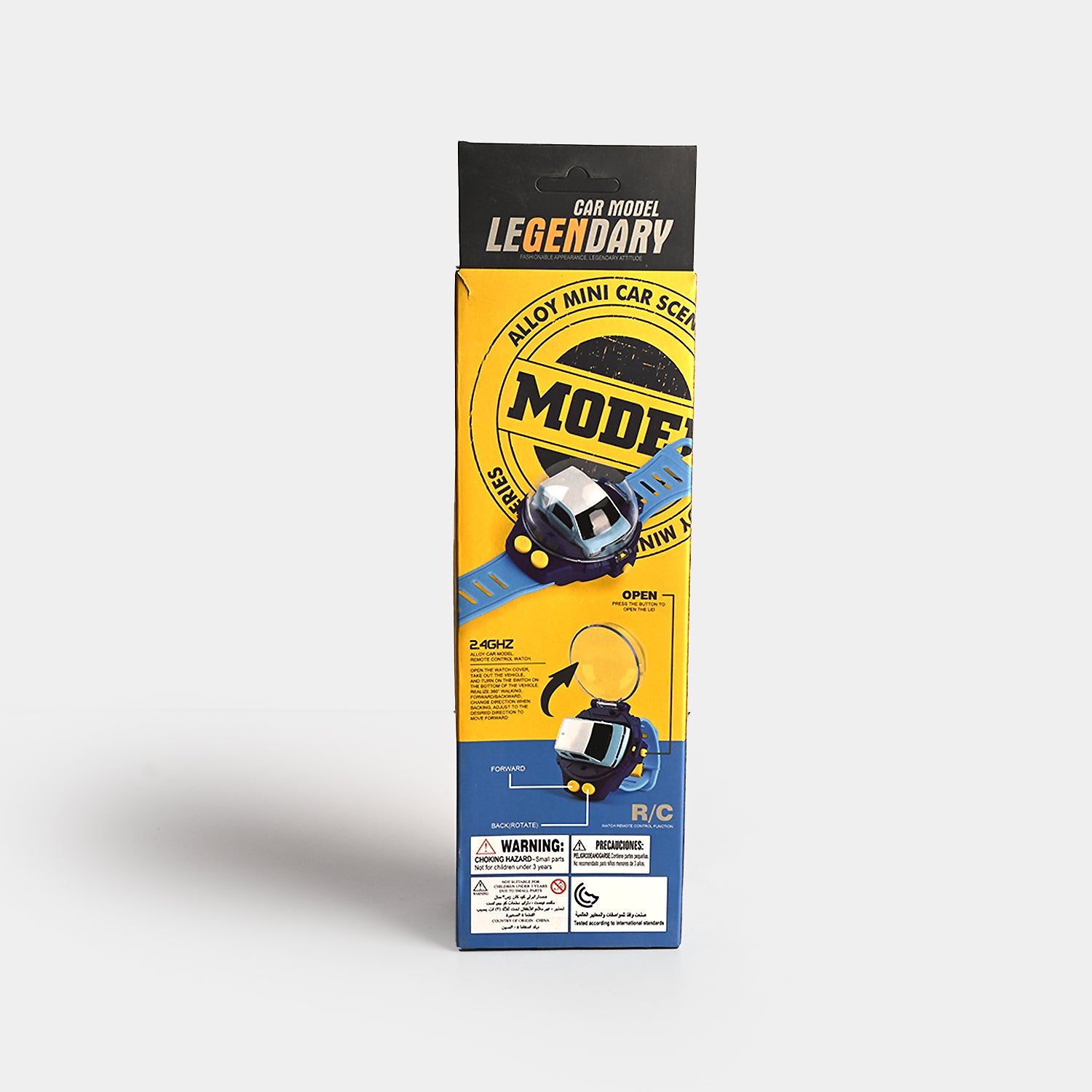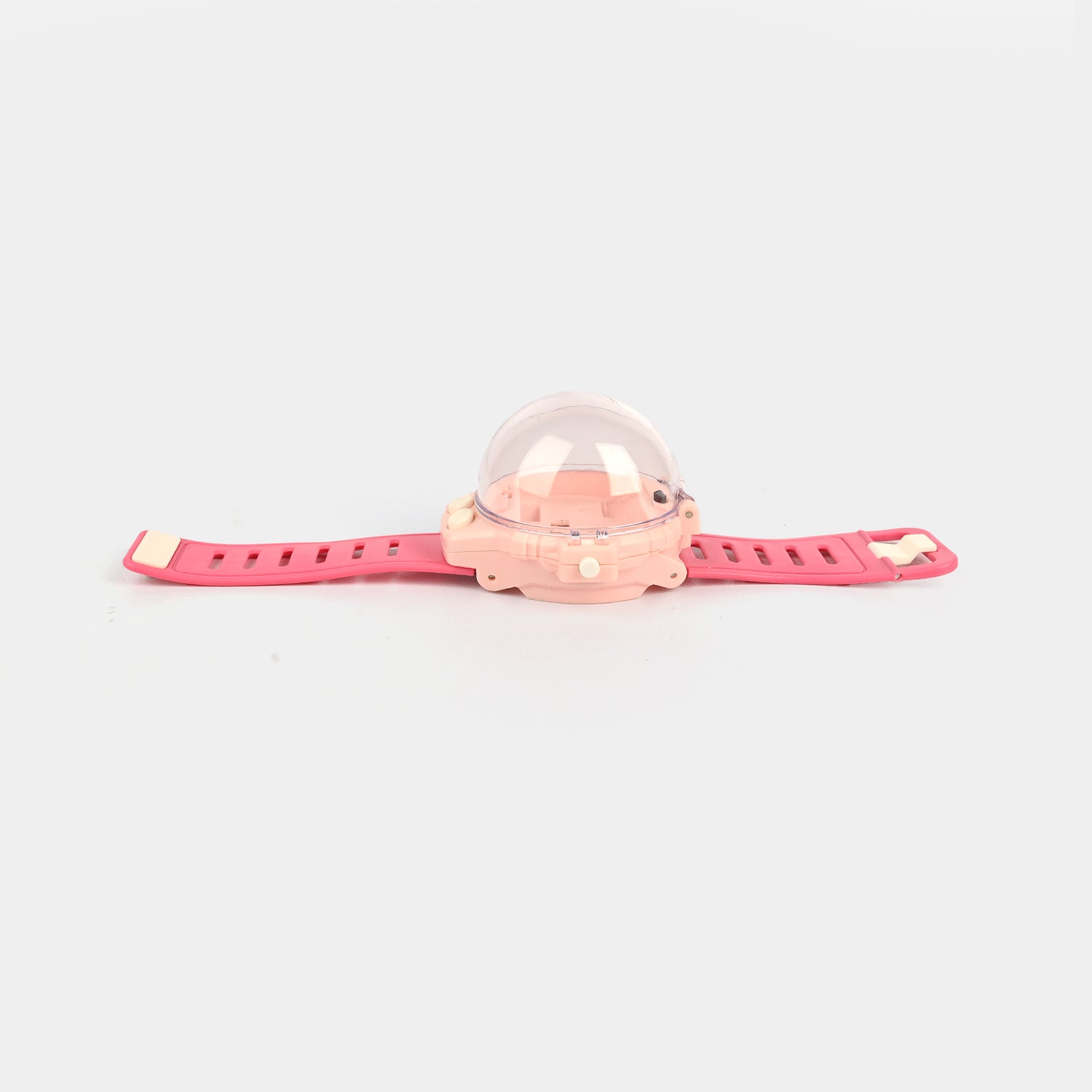 This Watch Remote Control Toy Car has a silicone wrist strap and two buttons for different functions. The right button moves the car in a circle while the left button moves the vehicle ahead.