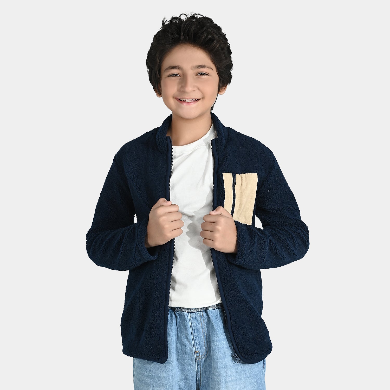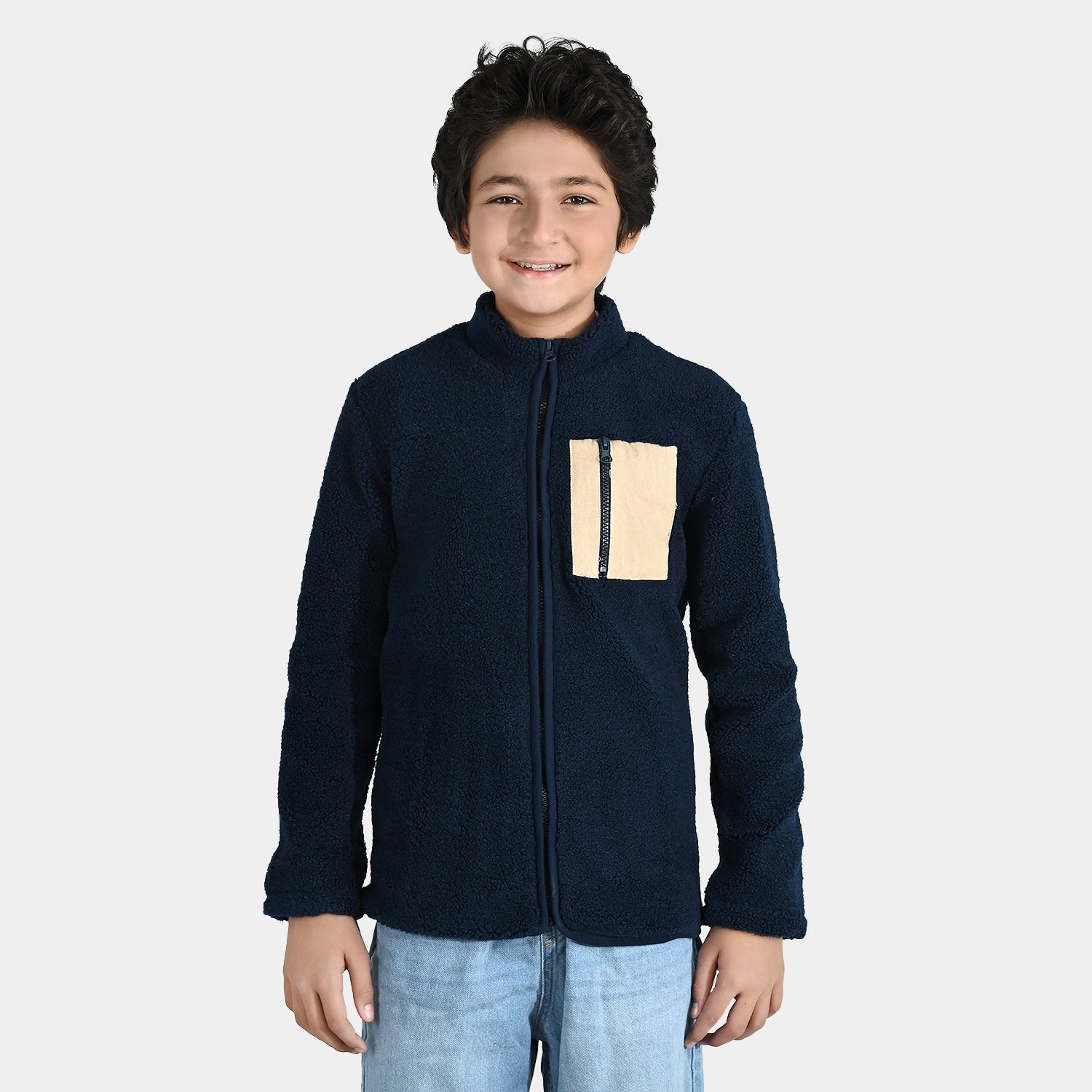 Boys navy zipper jacket with a mock neck, pocket, and full sleeves, designed for comfort and easy layering.