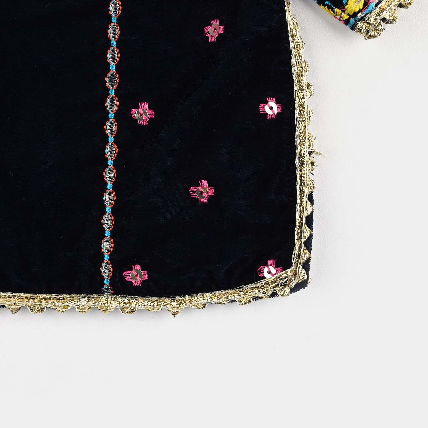 Wrap your little one in cozy elegance with this Velvet 3-Piece Set. Perfect for keeping her warm and stylish through the winter season. The soft velvet shirt features a round embroidered neckline, full sleeves, and beautifully detailed front panels. Paired with an embroidered shalwar and a contrasting dupatta, it creates a graceful, charming look that’s as comfortable as it is adorable. A lovely outfit for special occasions or winter gatherings.