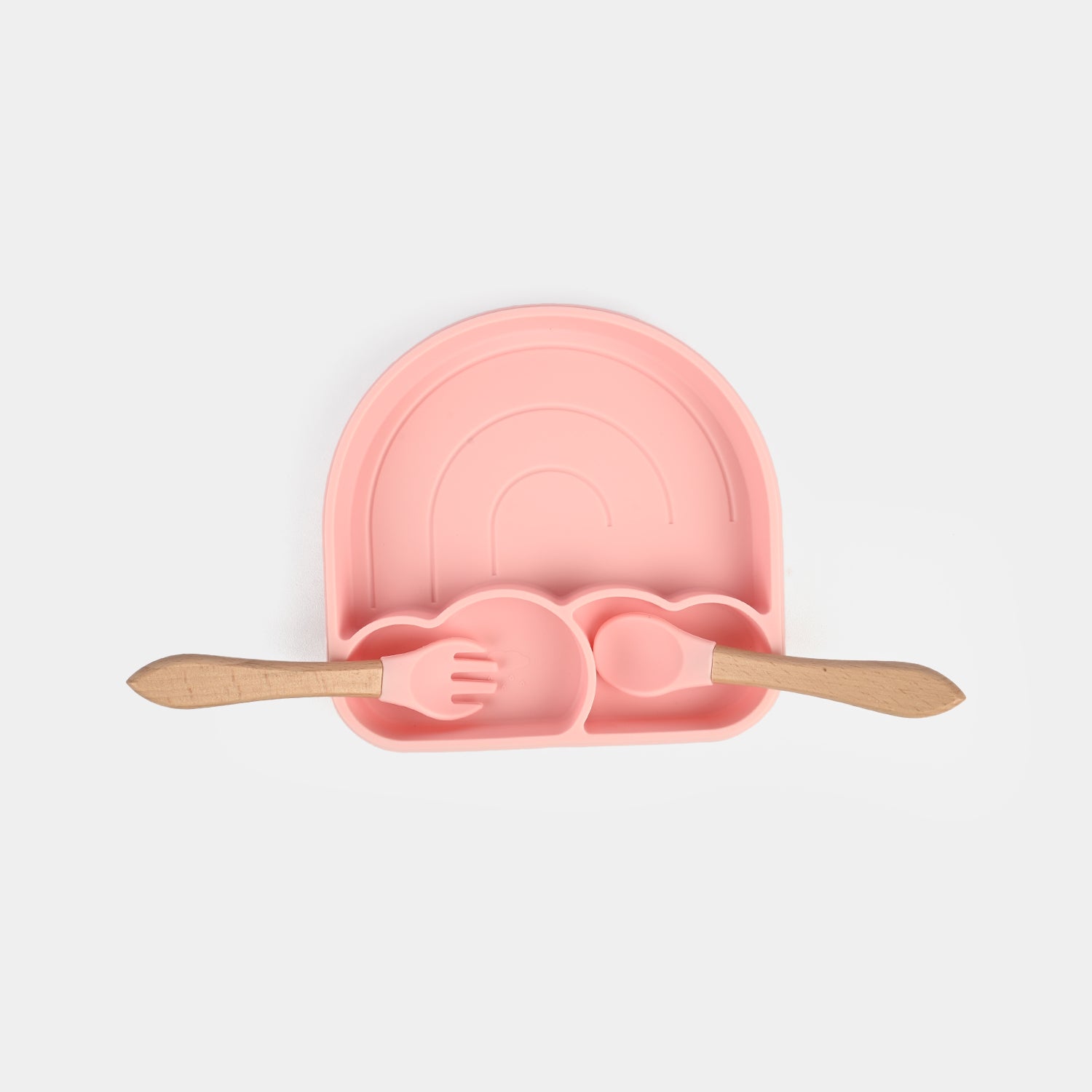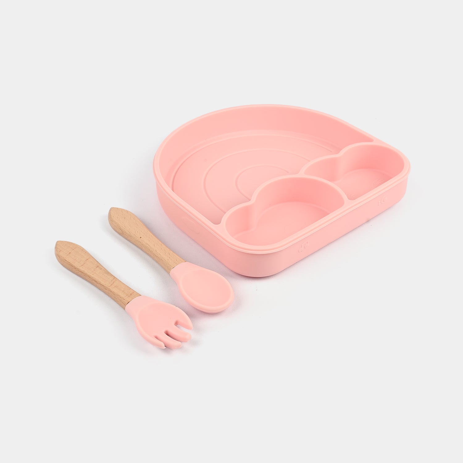 Baby Silicone Feeding Set features a suction plate with divided sections to organize meals and prevent spills. The set includes a spoon and fork with soft silicone tips, designed for safe self-feeding. Ideal for babies and toddlers transitioning to independent eating.
