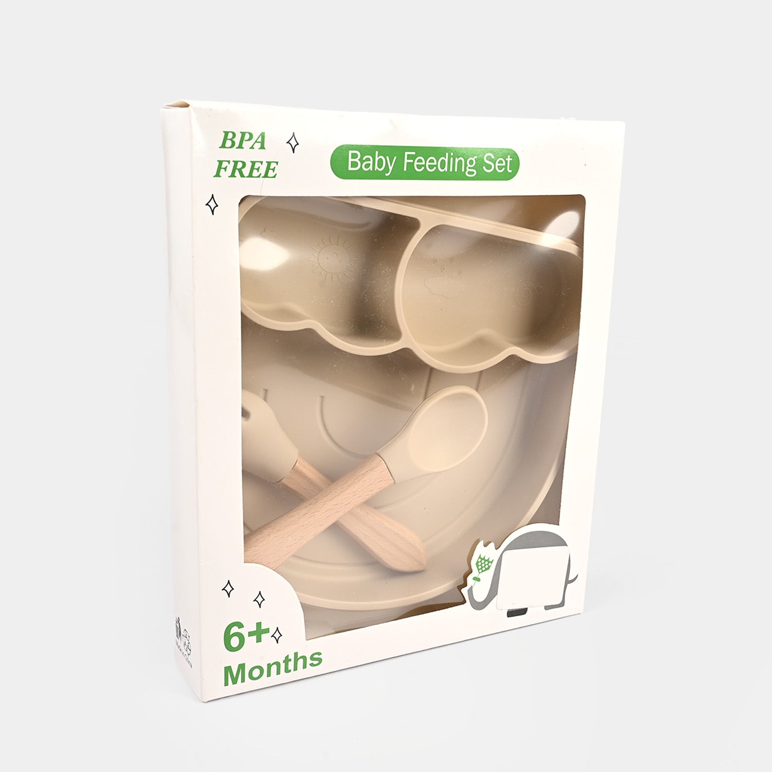 Baby Silicone Feeding Set features a suction plate with divided sections to organize meals and prevent spills. The set includes a spoon and fork and soft silicone tips, designed for safe self-feeding. Ideal for babies and toddlers transitioning to independent eating.