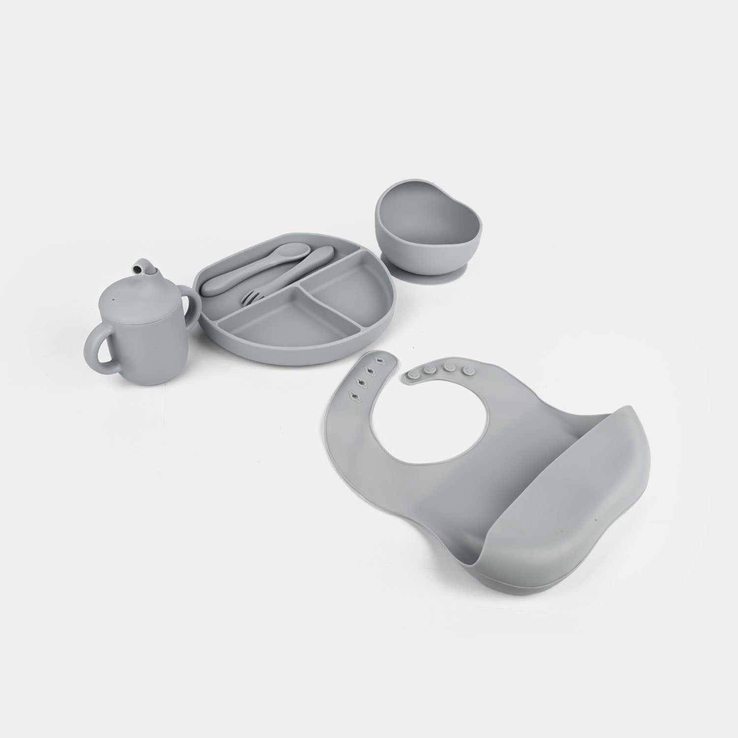 A complete silicone feeding set designed to make mealtime easier and safer for babies. Includes a bib, suction plate, bowl, cup, and utensils—crafted for comfort, durability, and mess-free feeding
