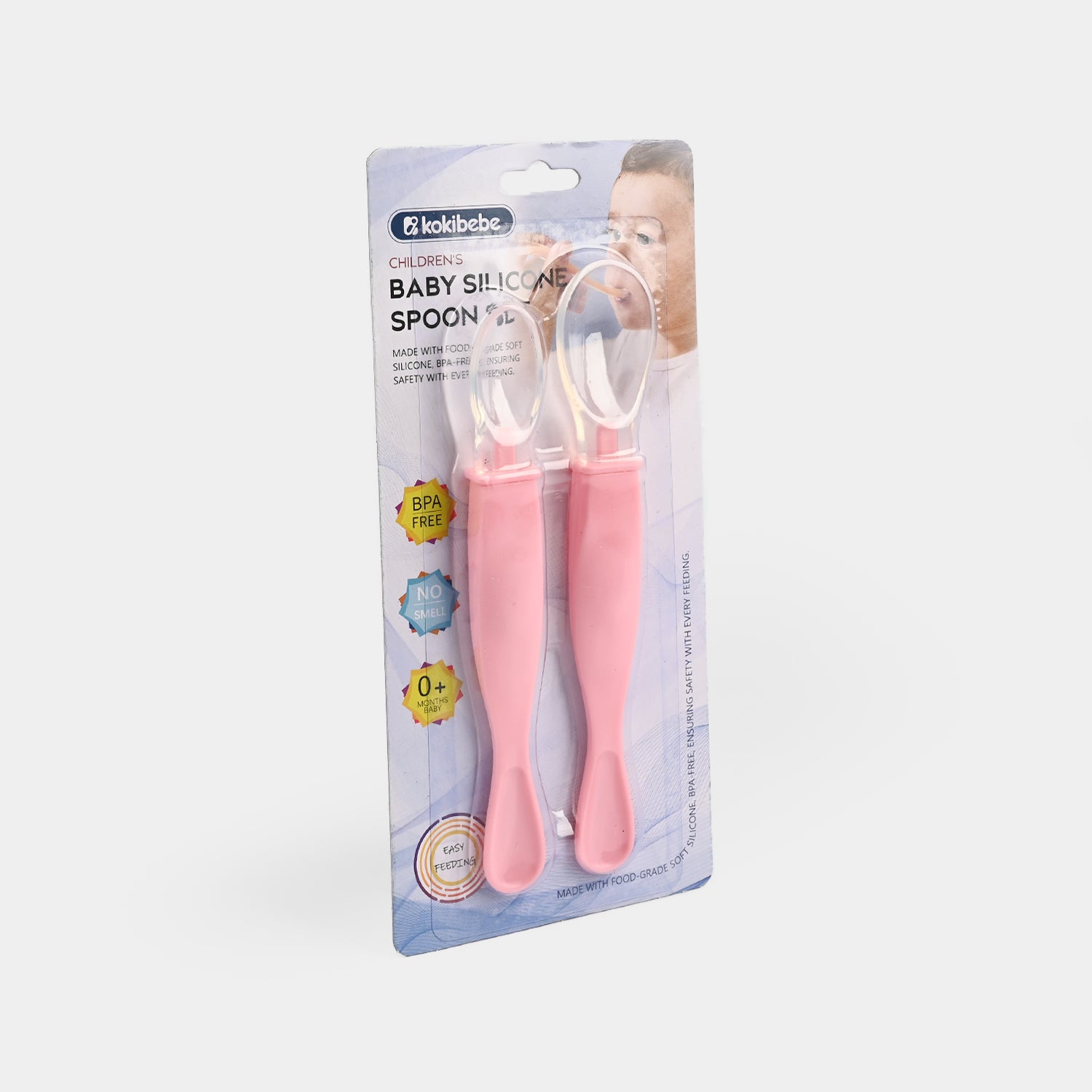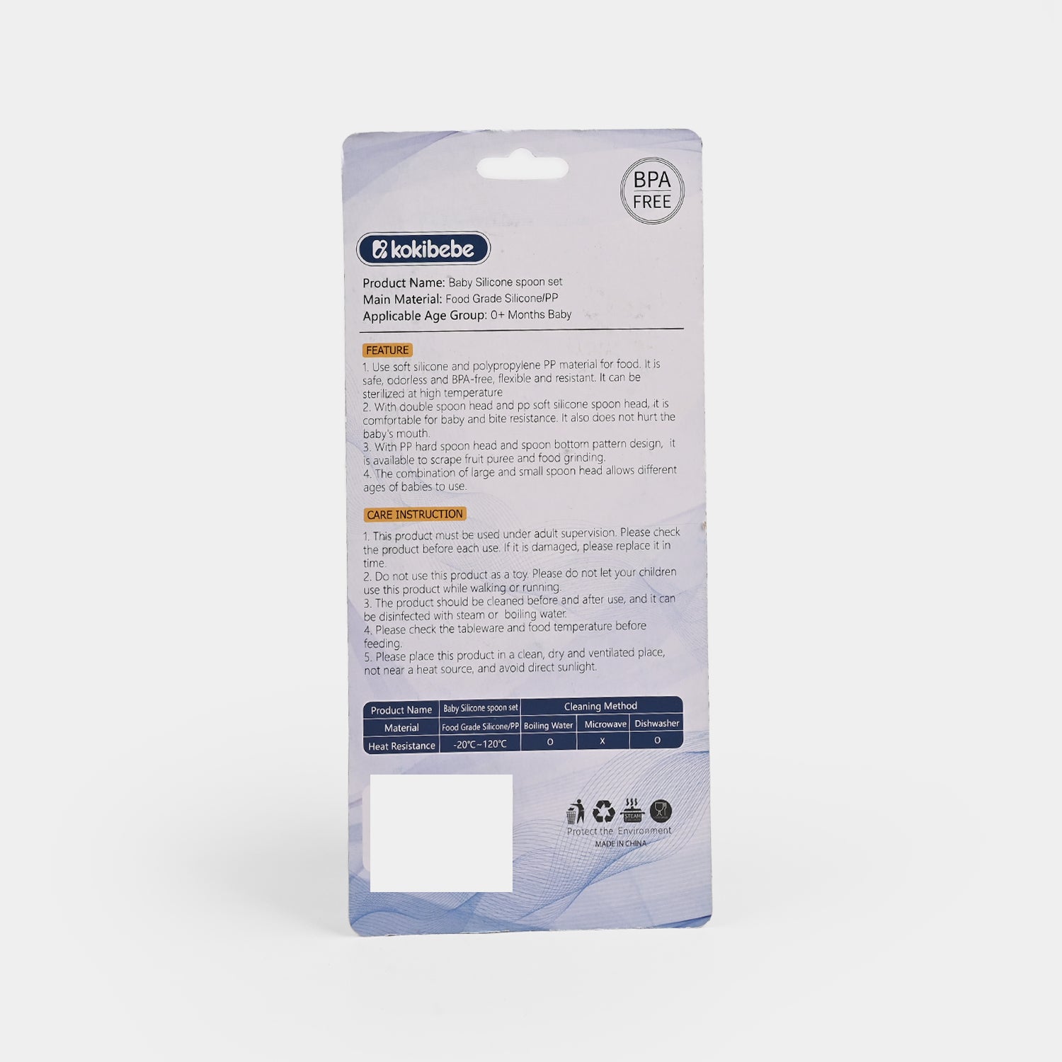 This is a baby silicone spoon set made from material that is safe for food. It is odorless, free from BPA, flexible, and resistant. The spoon's soft silicone head is comfortable for babies to use and is bite-resistant.