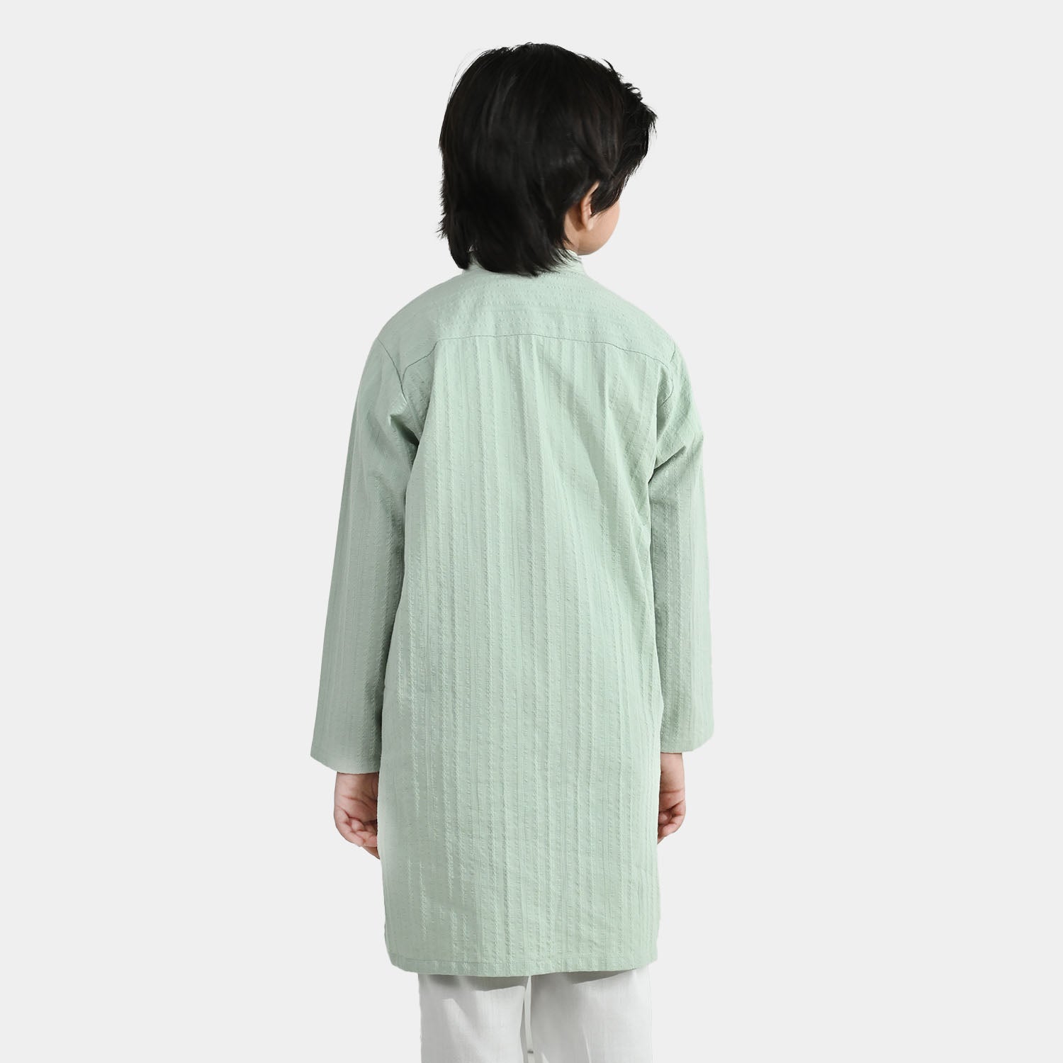 Boys' green cotton jacquard kurta featuring a sherwani collar and full sleeves, perfect for everyday wear.