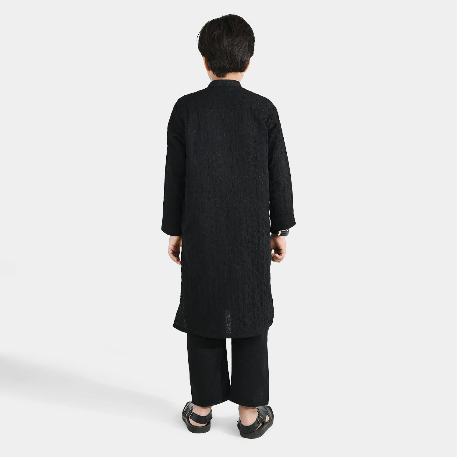 This black cotton chicken kari kurta pajama for boys features a sherwani collar, full sleeves, and matching pajama, perfect for a comfortable and stylish everyday look.