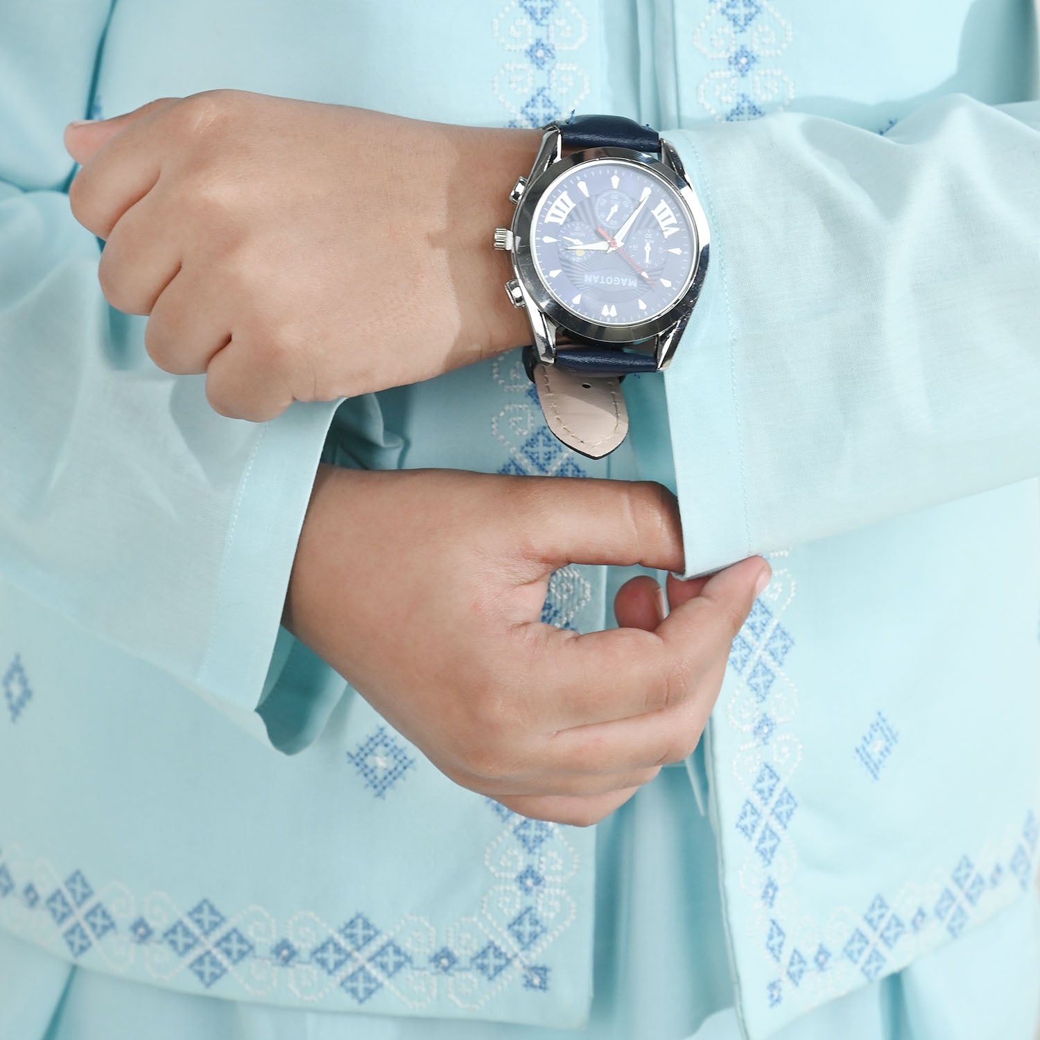Boys' light blue cotton poplin 3-piece suit featuring a kurta, pajama, and embroidered waistcoat, perfect for festive occasions or special outings.