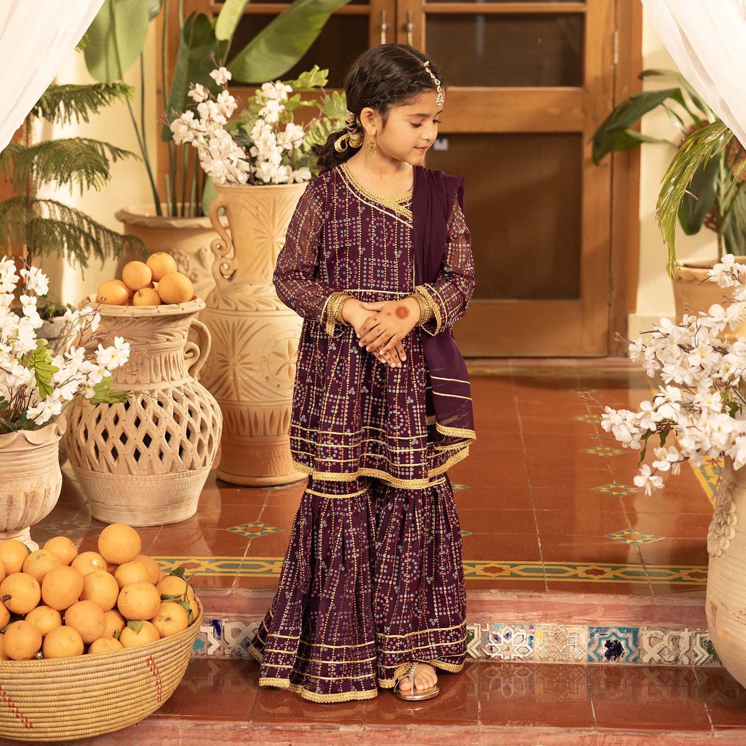 Purple 3-piece set for teens featuring an anarkali-style frock with lace accents and a dori, a matching gharara with lace trims, and a plain dupatta with delicate lace, perfect for festive occasions.