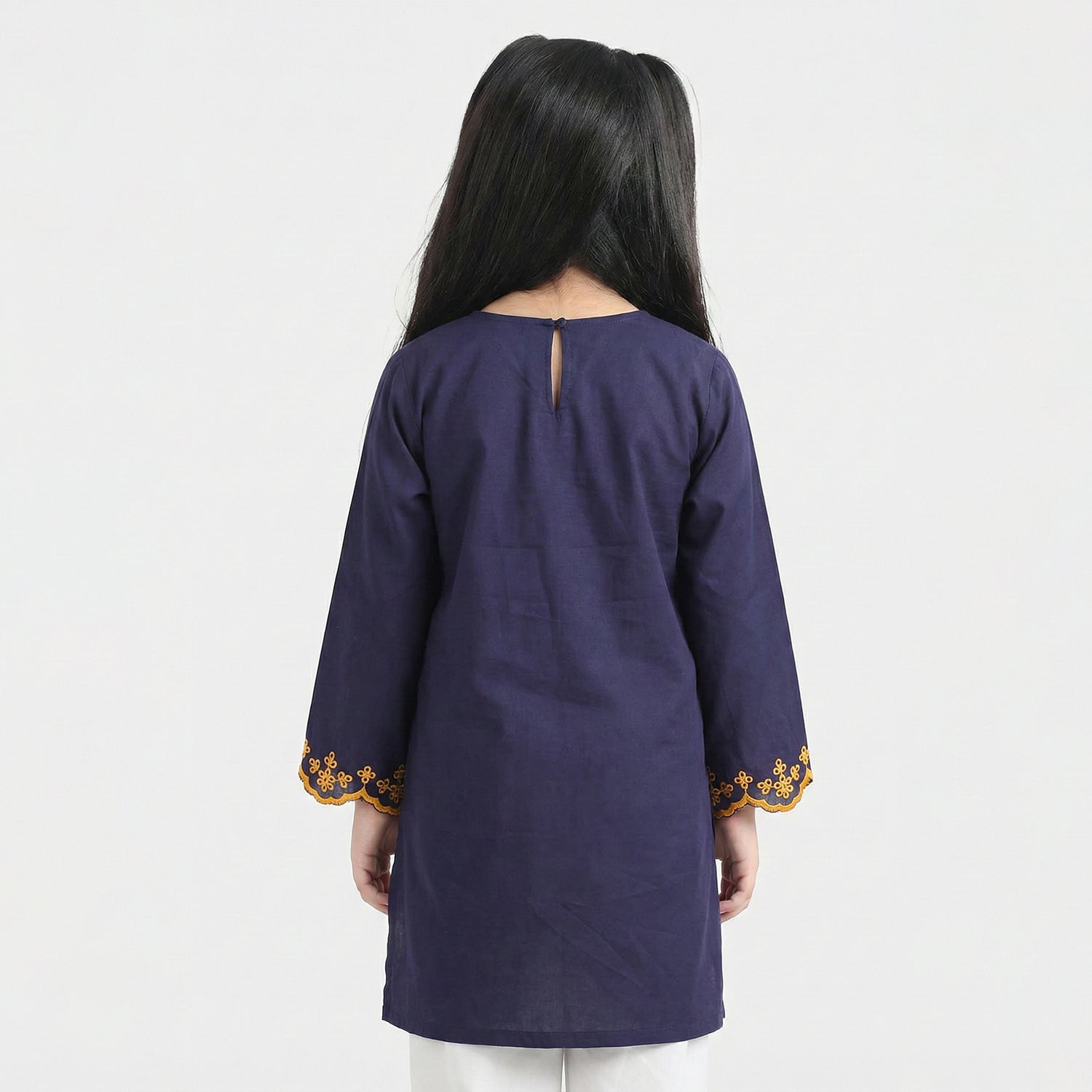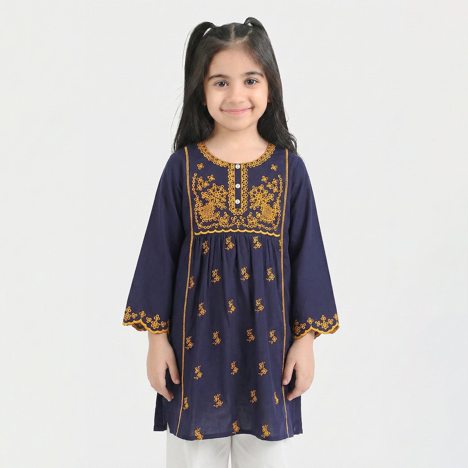 Girls navy-blue cotton kurti in frock style, featuring yellow embroidery on the sleeves and front, a round neckline with pearl detailing, combining traditional charm with all-day comfort.
