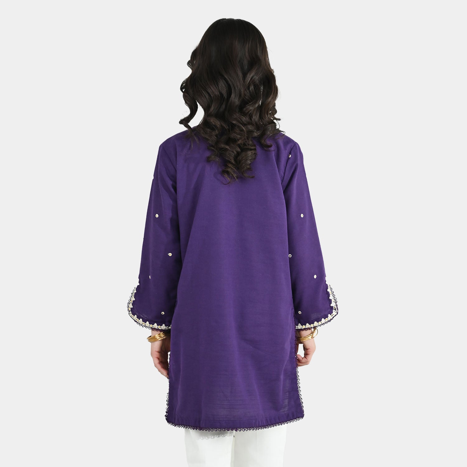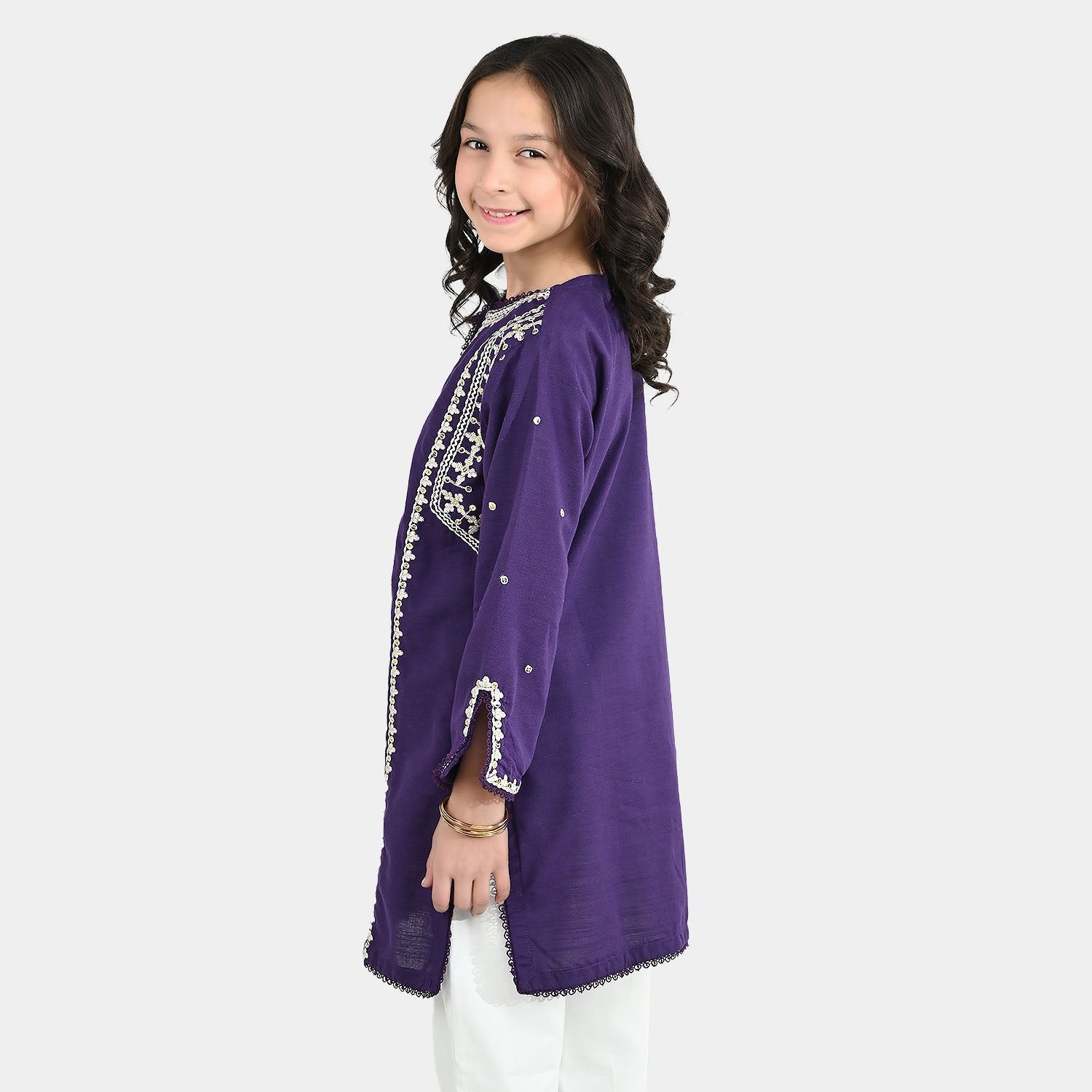 Girls' purple cotton slub embroidered kurti featuring full sleeves and lace detailing, perfect for a stylish and comfortable everyday look.