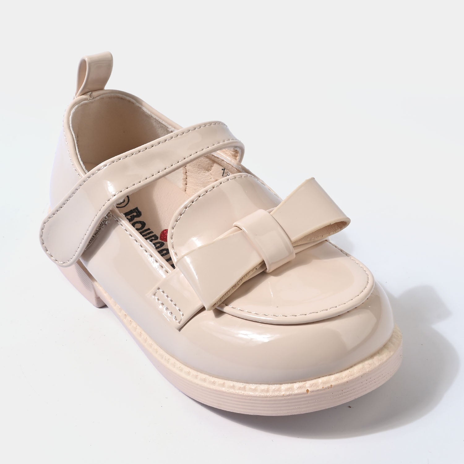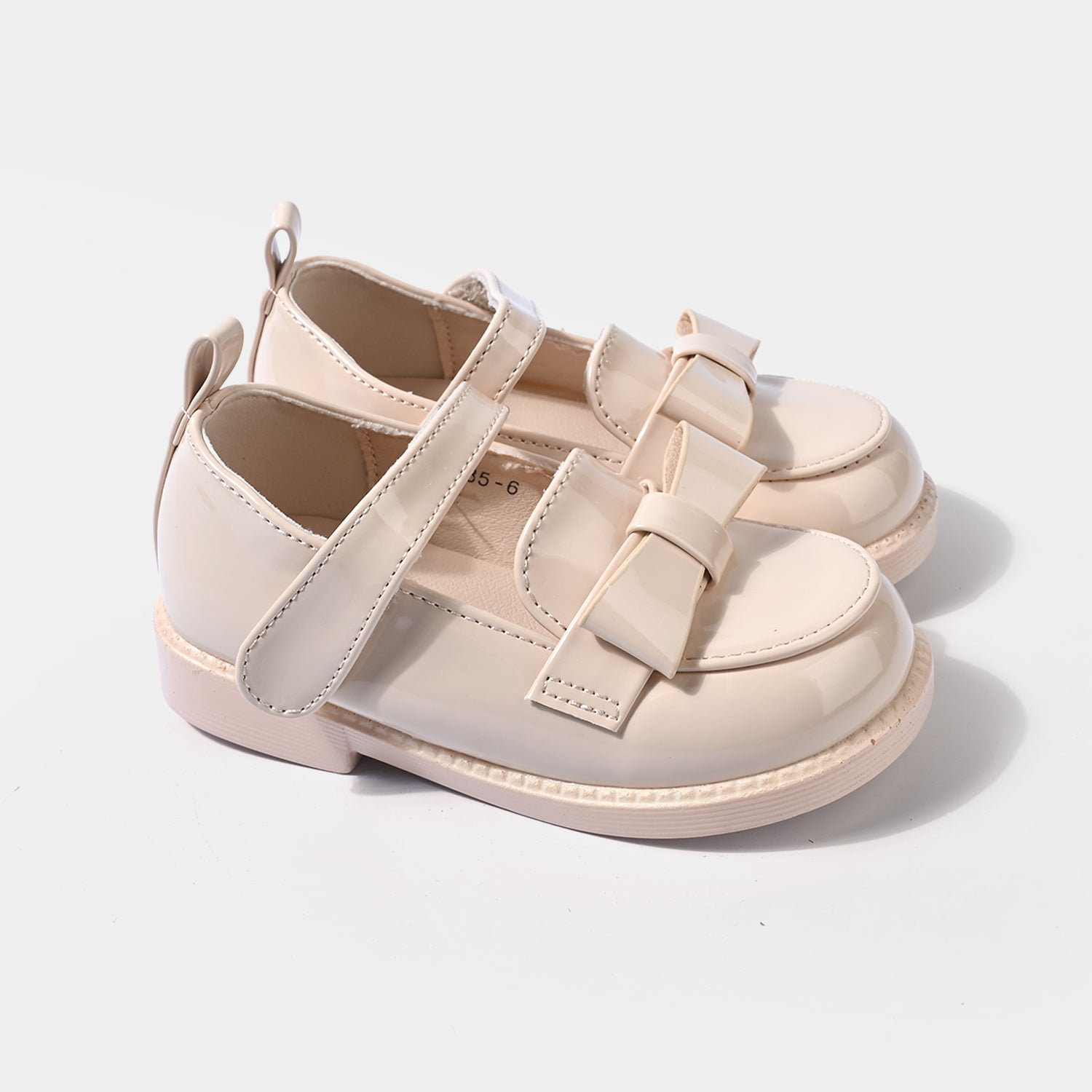 These plain beige girls’ pumps feature a delicate design with a strap and bow embellishment, perfect for casual everyday wear.