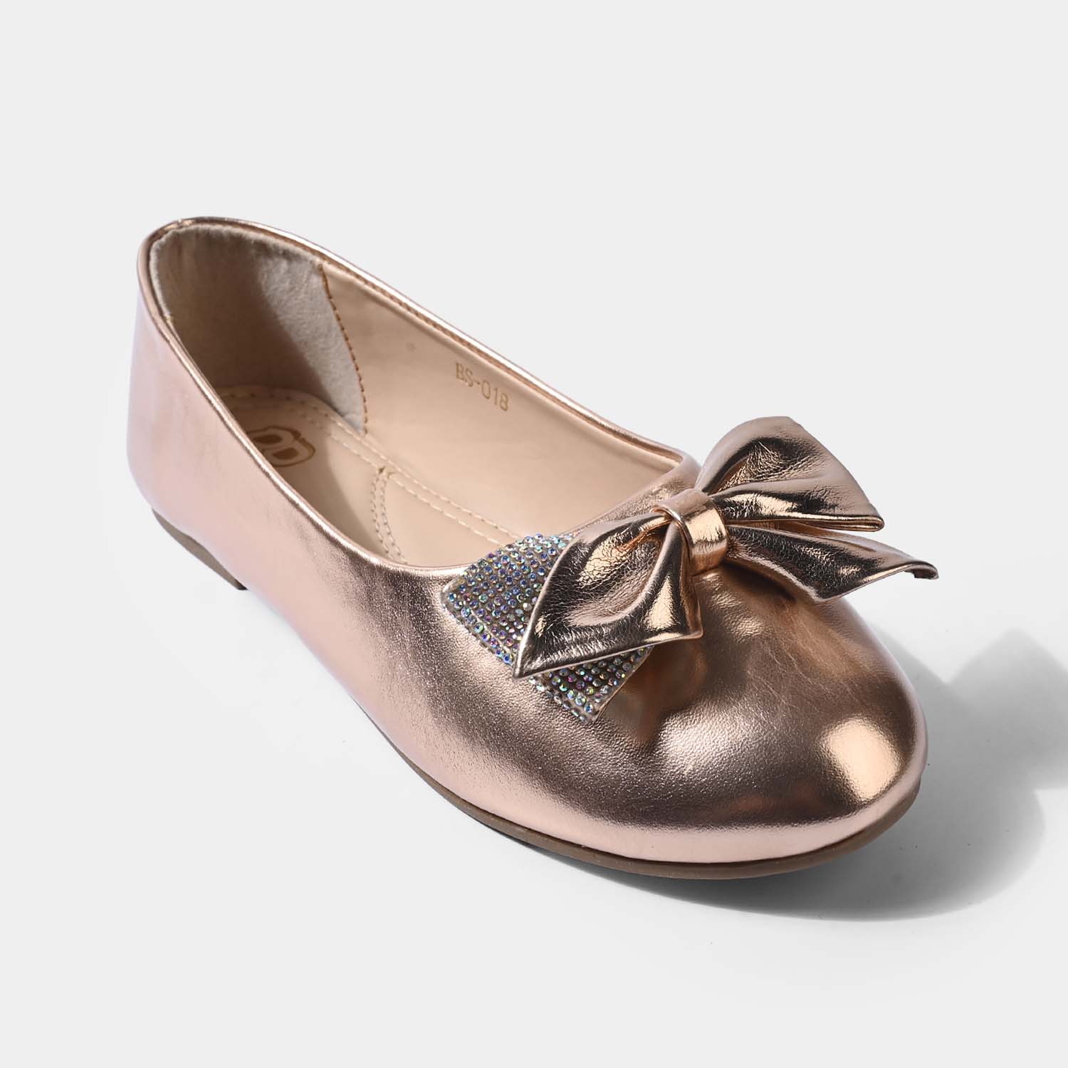 Girls' champagne pumps featuring a shiny finish and bow embellishment, perfect for formal occasions and stylish everyday wear.