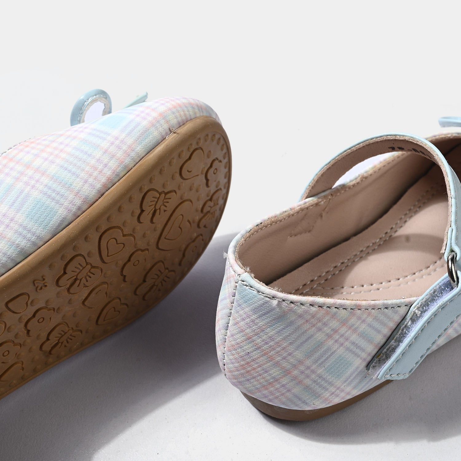 This blue flat pump features a matte finish with a checkered pattern and bow detail. An adjustable strap and cushioned lining provide a secure, comfortable fit for everyday wear or special occasions.